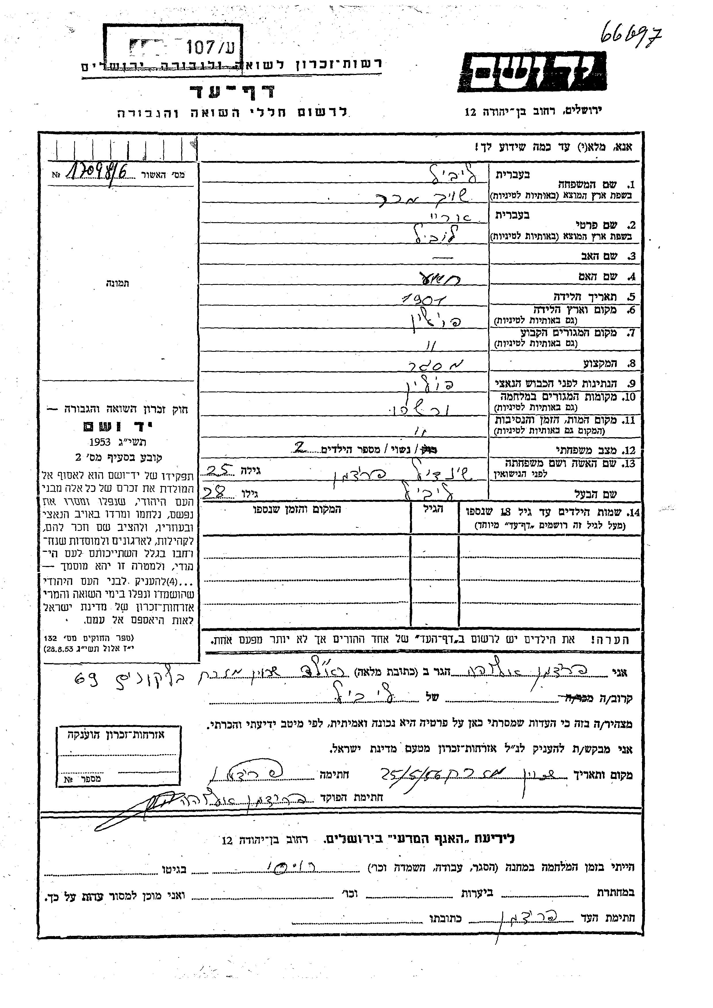 Ariy Leibil Shukhmakher was born in Poland, 1901 to Khaie. He was a metalworker and married to Sheindil nee Fridman. Prior to WWII he lived in Poland. During the war he was in Warsaw, Poland. Ariy Leibil was murdered in the Shoah. Place of death: Warsaw, Poland.