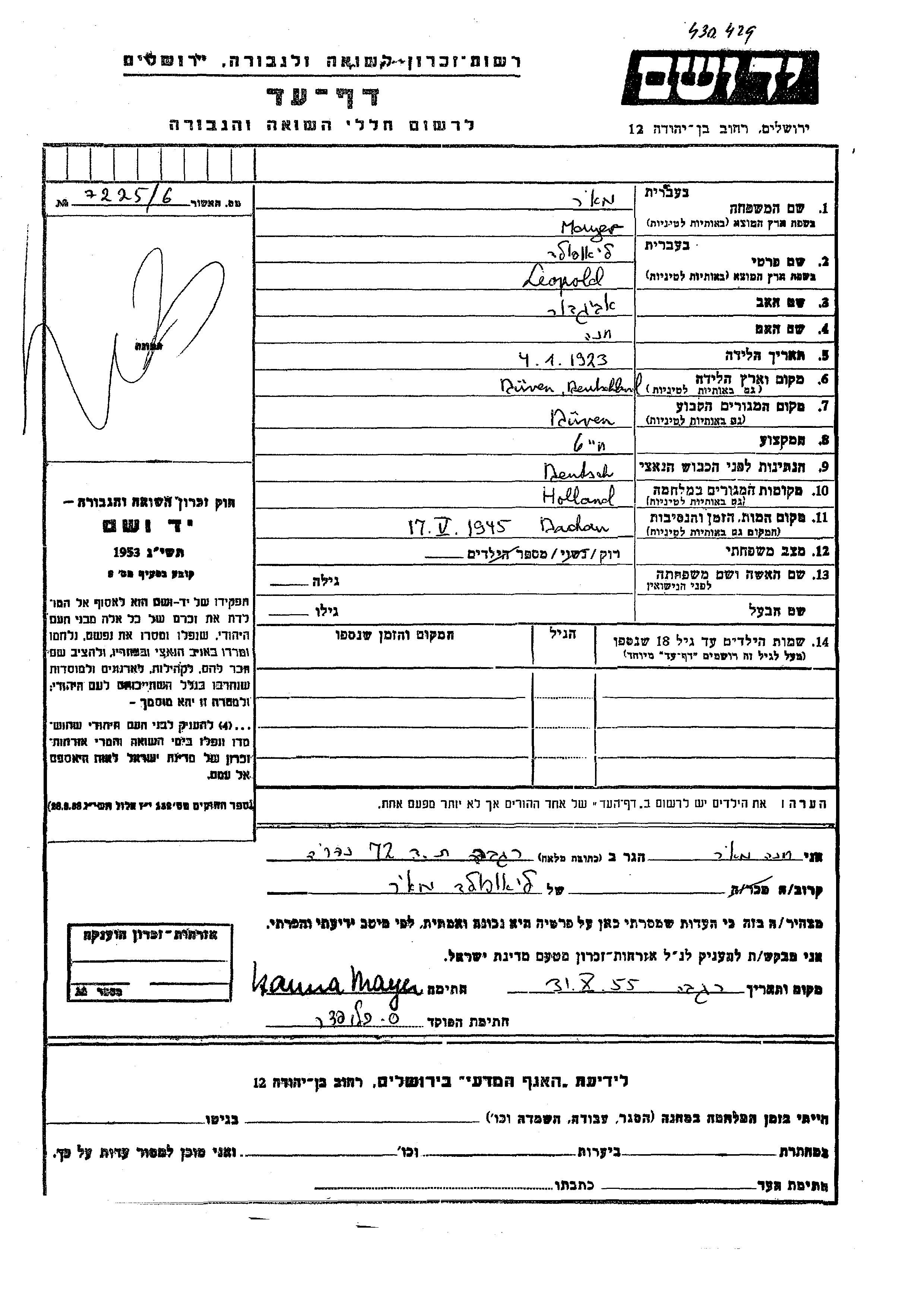 Liopold Mayer was born in Dueren, Germany, 1923 to Avigdor and Khana. He was a tailor and single. Prior to WWII he lived in Dueren, Germany. During the war he was in The Netherlands. Liopold was murdered in the Shoah. Place of death: Dachau, Germany, 1945.