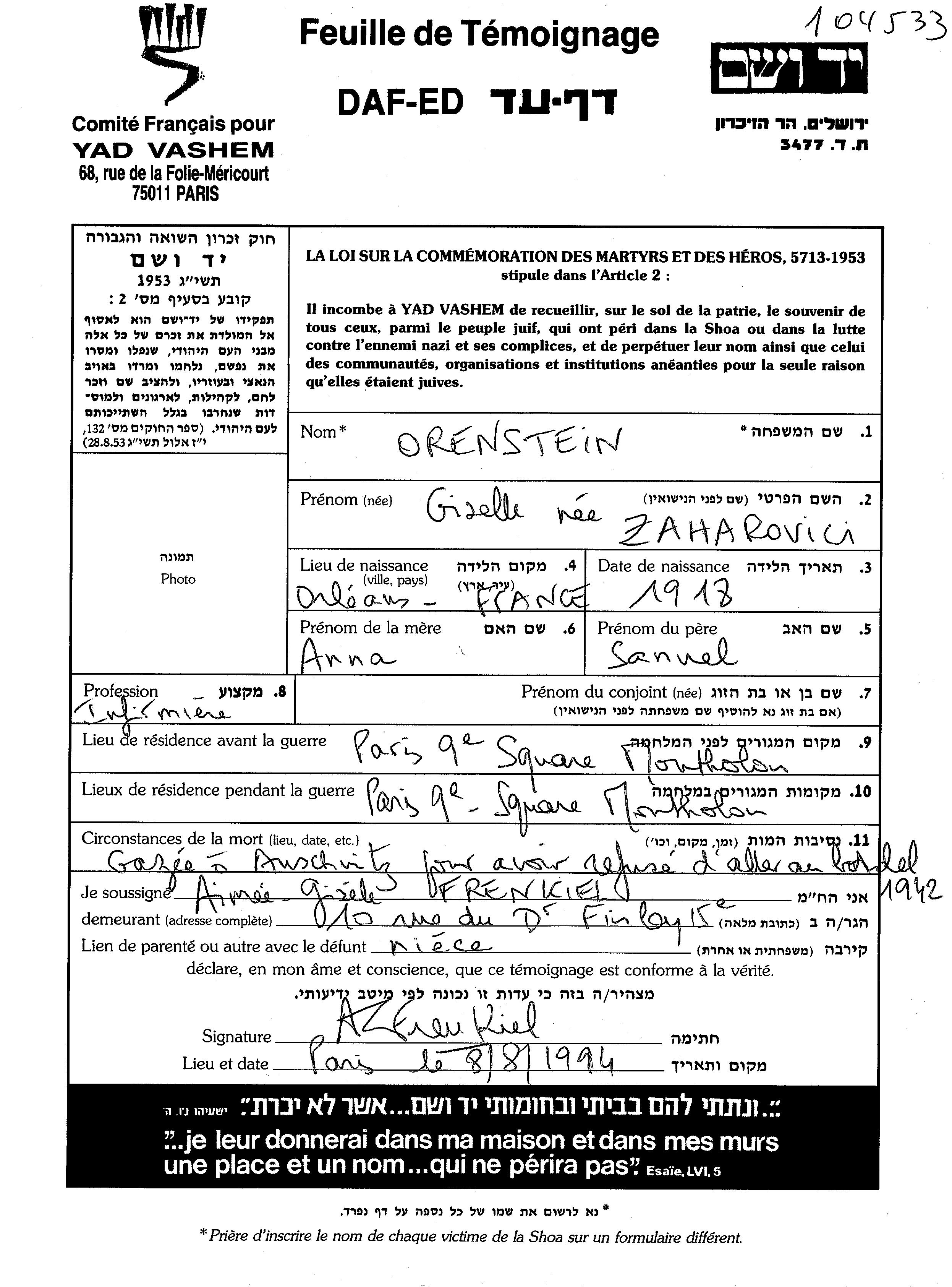 Orenstein Gizelle 1918 Paris, France Page of Testimony