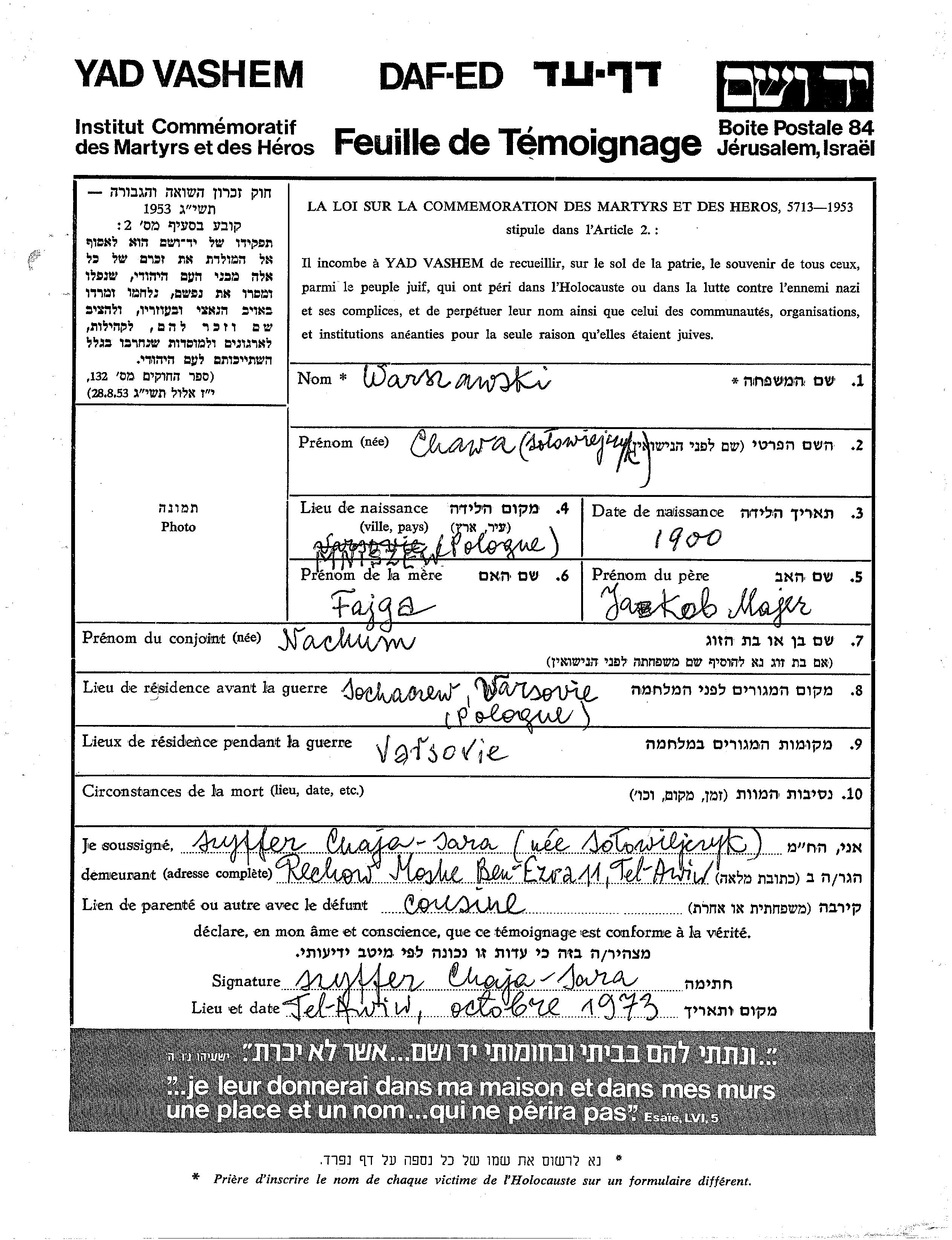 Chawa Warszawski nee Solowiejczyk was born in Mniszew, Poland, 1900 to Jakob Majer and Fajga. Prior to WWII she lived in Sochaczew, Poland. During the war she was in Varsovie, Poland. Chawa was murdered in the Shoah.