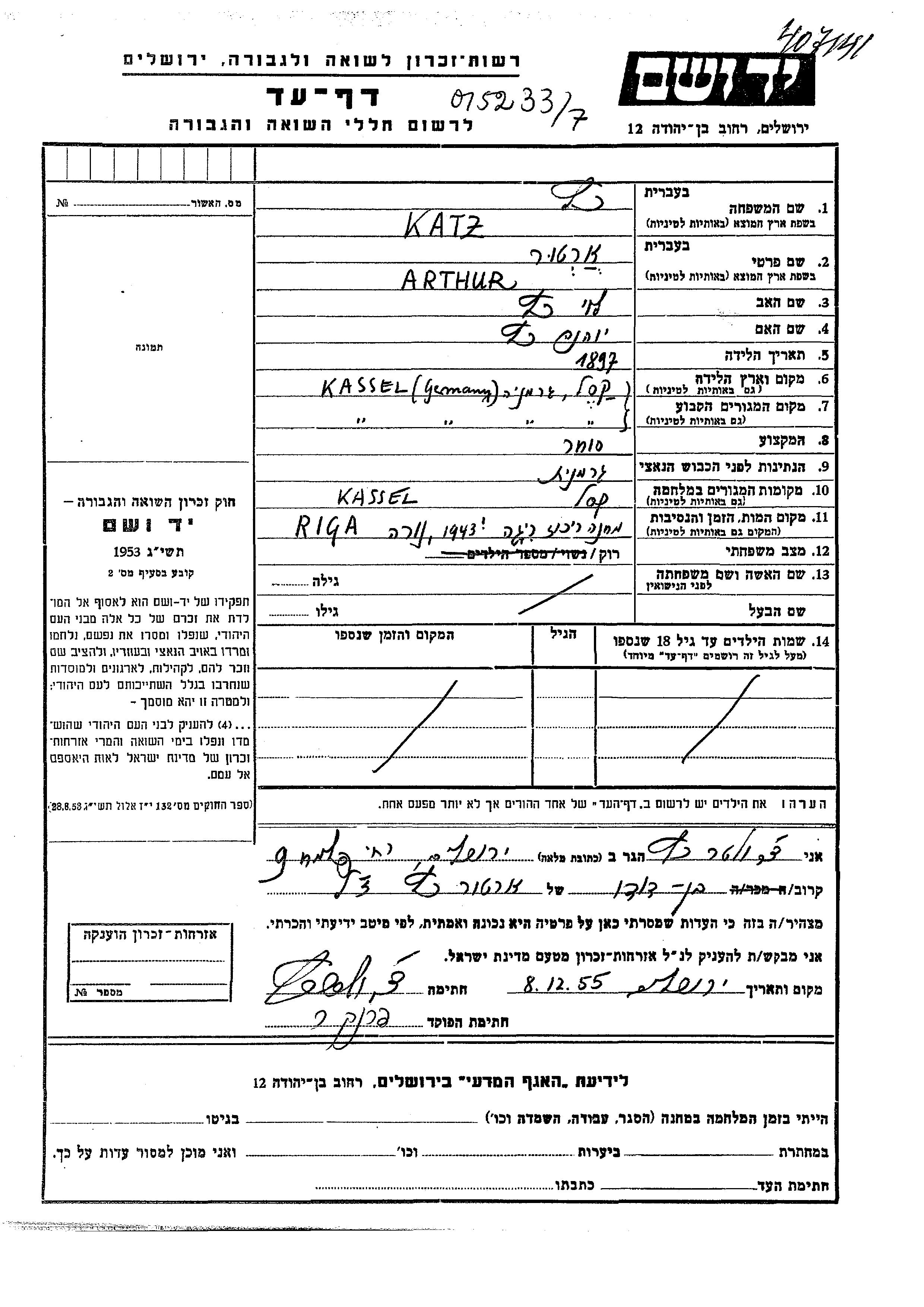 Katz Arthur 1897 Kassel, Germany Page of Testimony
