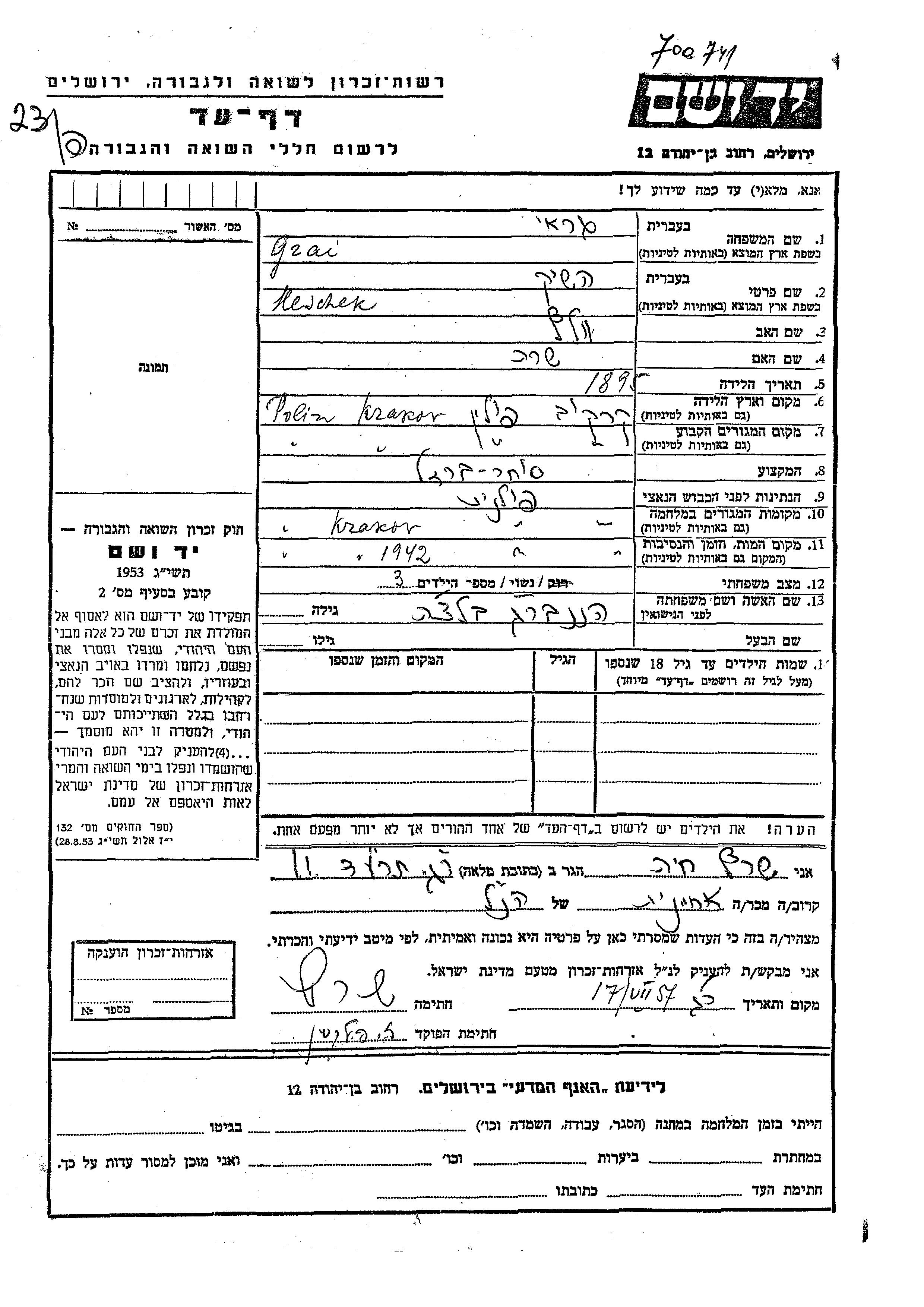 Grai Garai Heschek Heshik 1895 Krakow, Poland Page of Testimony