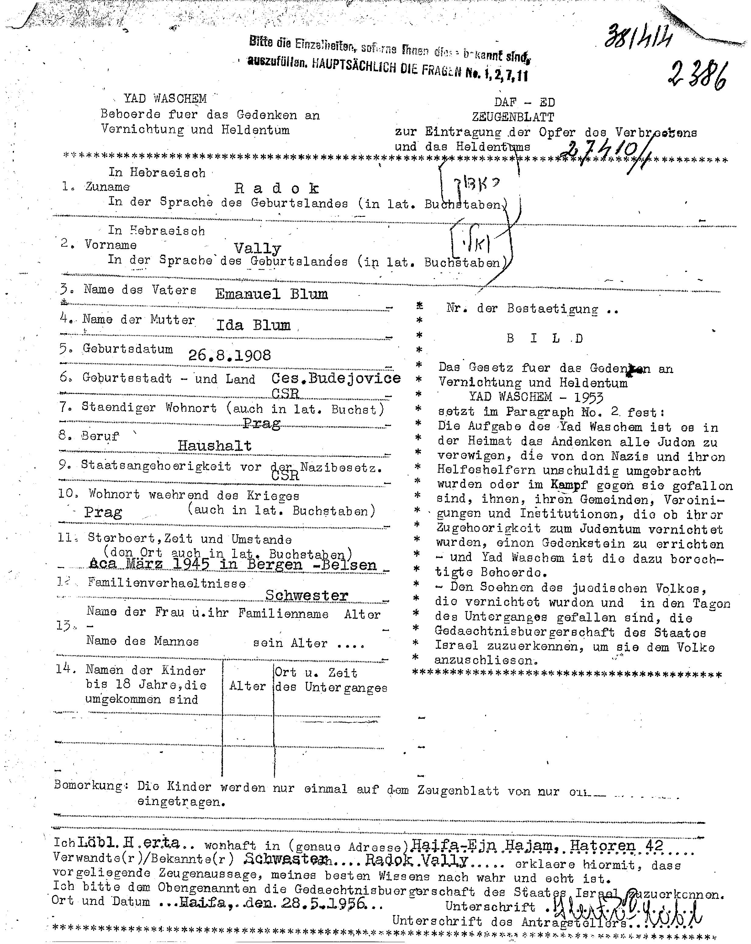 Radok Vally Vali 1908 Prag, Czechoslovakia Page of Testimony