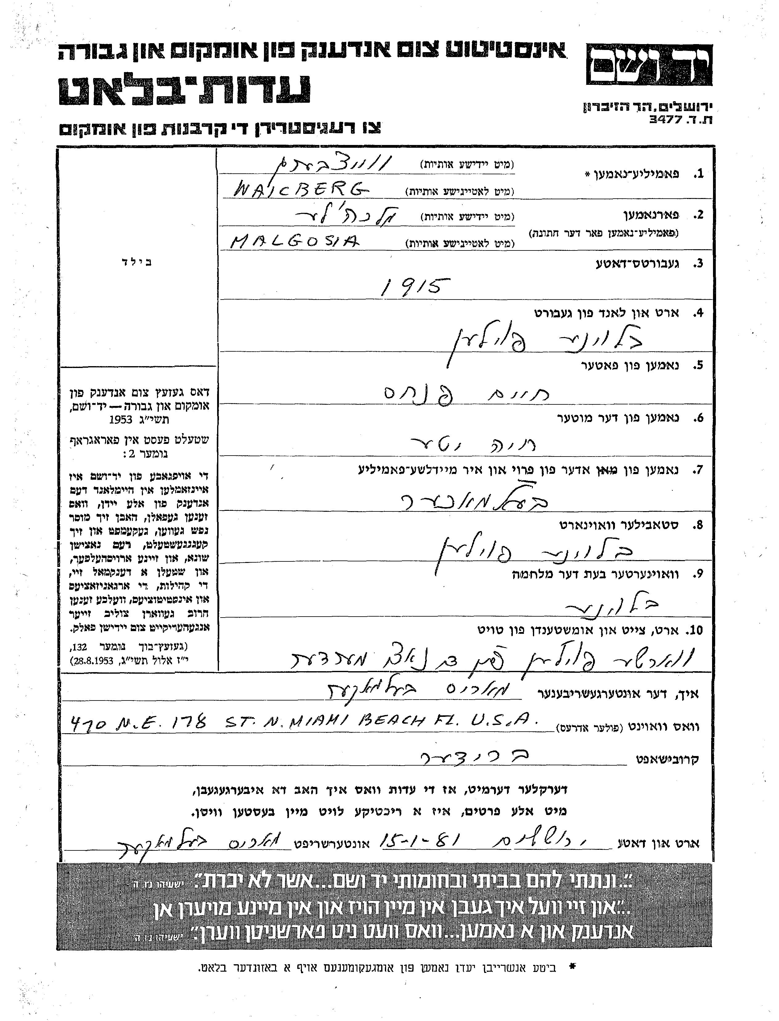 Waicberg Malgosia Malkale 1915 Blojna, Poland Page of Testimony