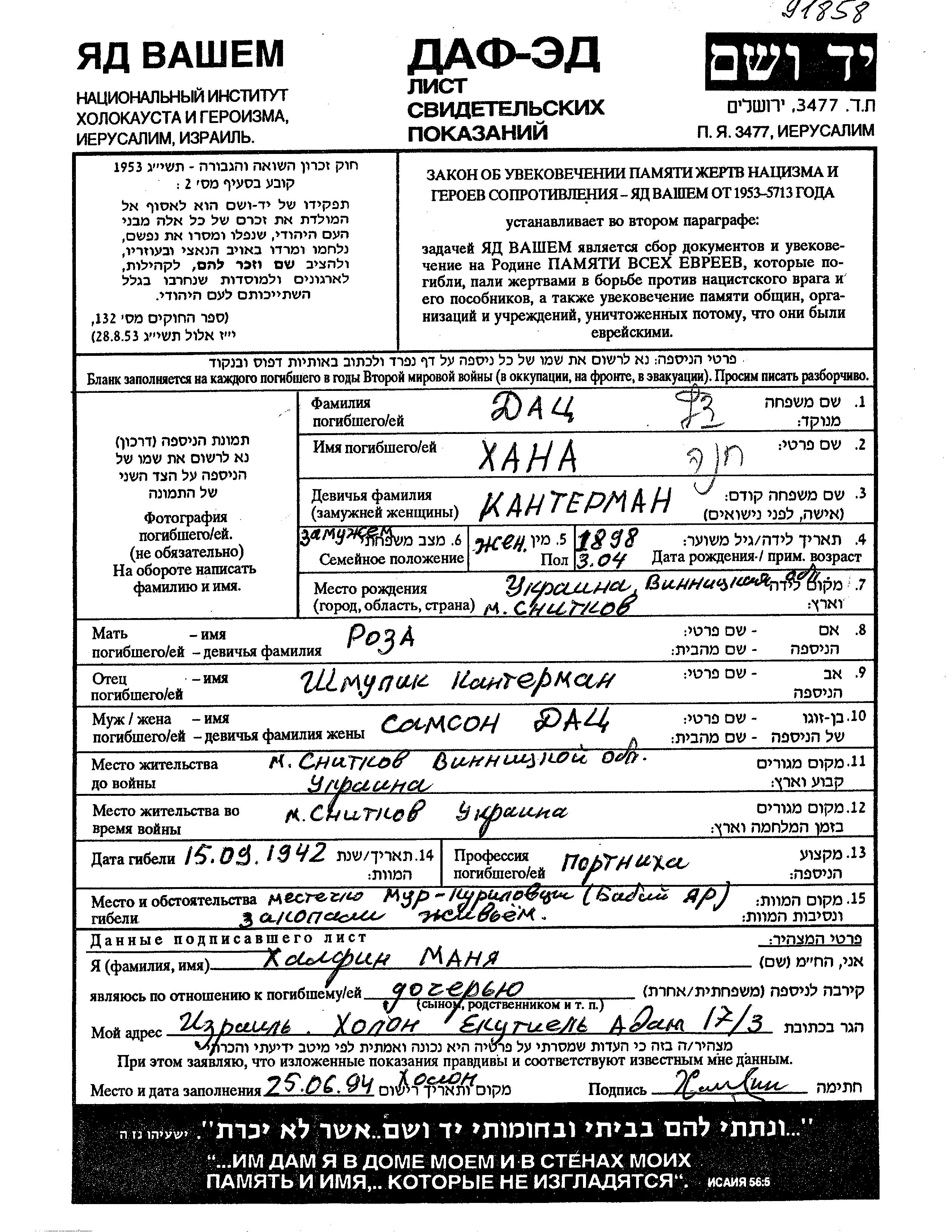 Khana Datz nee Kanterman was born in Snitkov, Ukraine (USSR), 1898 to Shmulik and Roza. She was a seamstress and married to Samson. Prior to WWII she lived in Snitkov, Ukraine (USSR). During the war she was in Snitkov, Ukraine (USSR). Khana was murdered in the Shoah. Place of death: Murovanyye Kurilovtsy, Ukraine (USSR), 1942.
