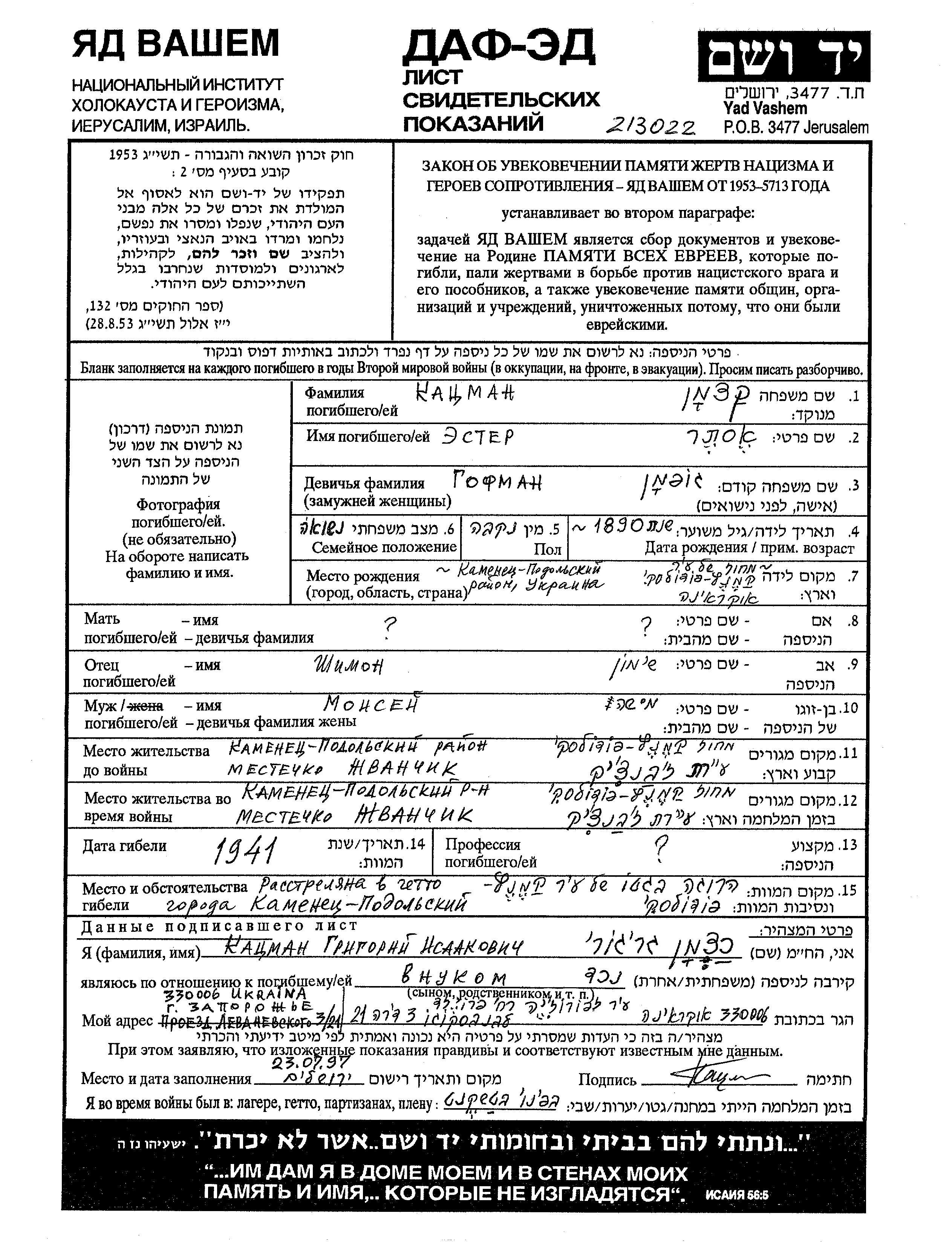 Ester Katzman nee Gofman was born in Kamenets Podolskiy, Ukraine (USSR), 1890 to Shimon. She was married to Moisei. Prior to WWII she lived in Zhvanchik, Ukraine (USSR). During the war she was in Zhvanchik, Ukraine (USSR). Ester was murdered in the Shoah. Place of death: Kamenets Podolsk, Ukraine (USSR), 1941.