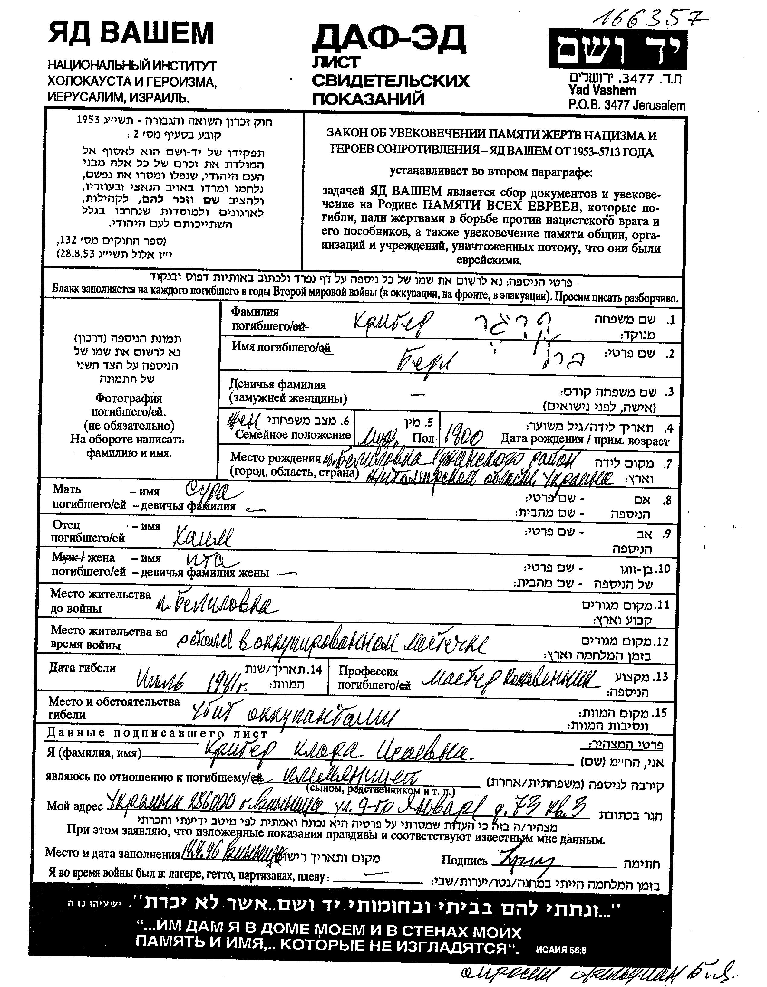 Kriger Berl 1900 Belilovka, Ukraine (USSR) Page of Testimony