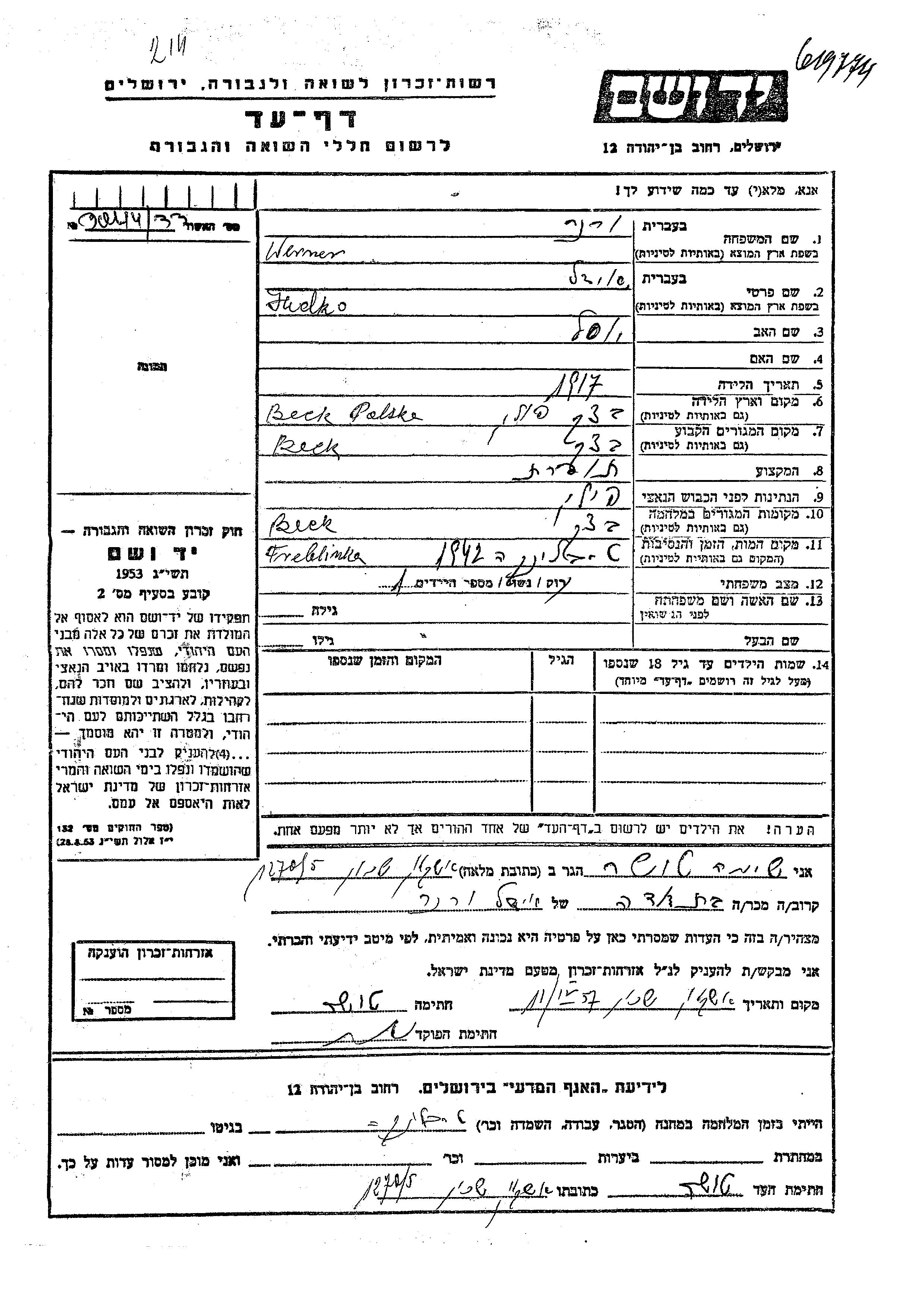 Judko Idl Werner was born in Baczki, Poland, 1917 to Yosel. He was a seamstress and married. Prior to WWII he lived in Baczki, Poland. During the war he was in Baczki, Poland. Judko Idl was murdered in the Shoah. Place of death: Treblinka, Poland, 1942.