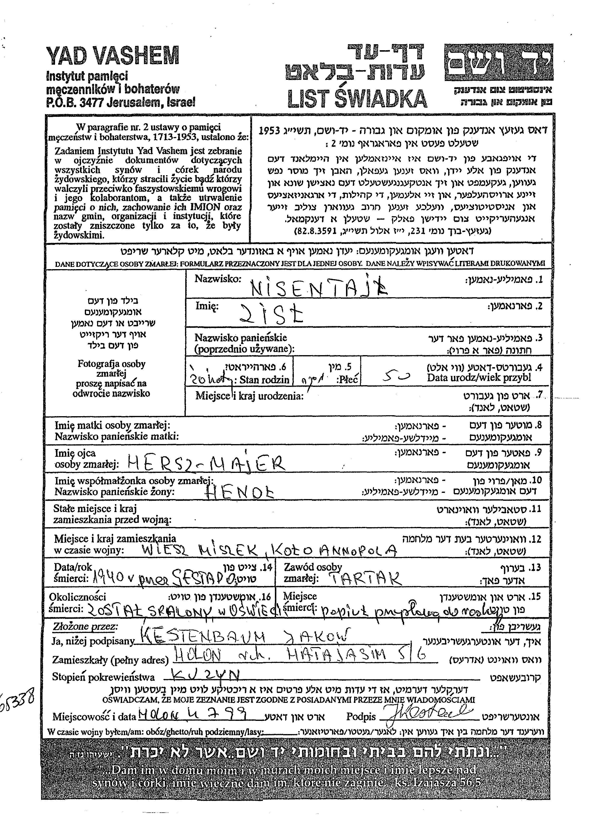 Zisl Nisentajl was born, 1890 to Hersz Majer. He was a tartak and married to Henok. During the war he was in Mniszek, Poland.