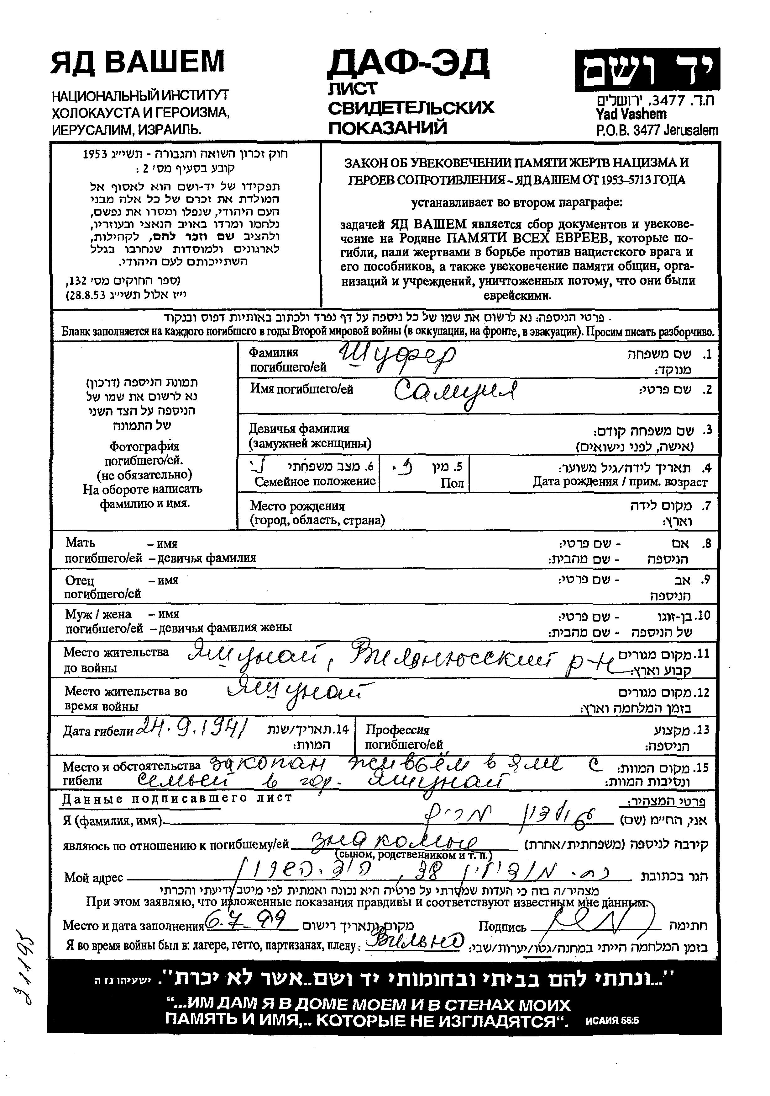 Samuil Shufer. He was married. Prior to WWII he lived in Jaszuny, Poland. During the war he was in Jaszuny, Poland. Samuil was murdered in the Shoah. Place of death: Jaszuny, Poland, 1941.