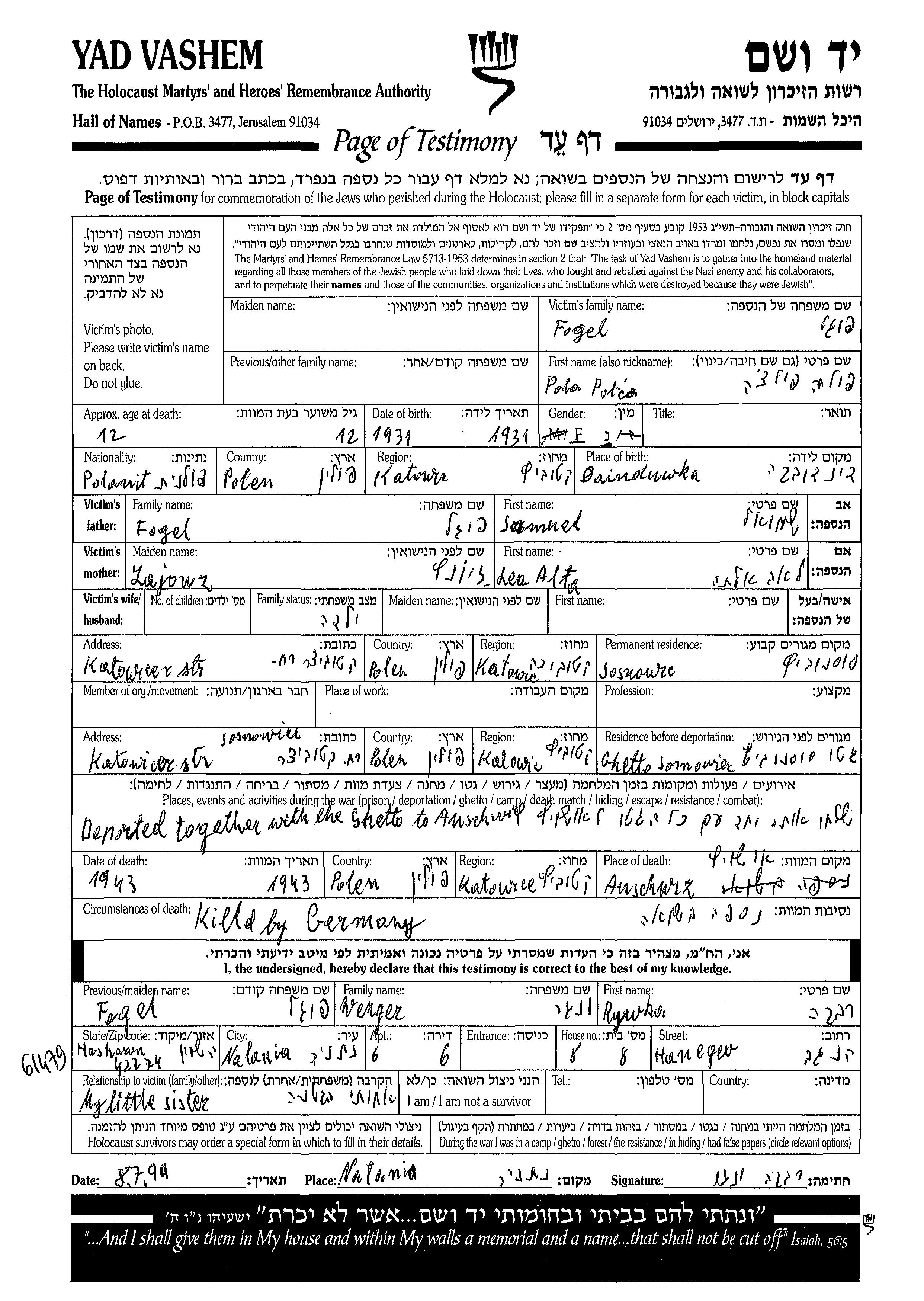 Pola Fogel was born in Dandowka, Poland, 1931 to Shmuel and Alta Lea. She was child. Prior to WWII she lived in Sosnowic, Poland. During the war she was in Sosnowiec, Poland. Pola was murdered in the Shoah. Place of death: Auschwitz, Poland, 1943.