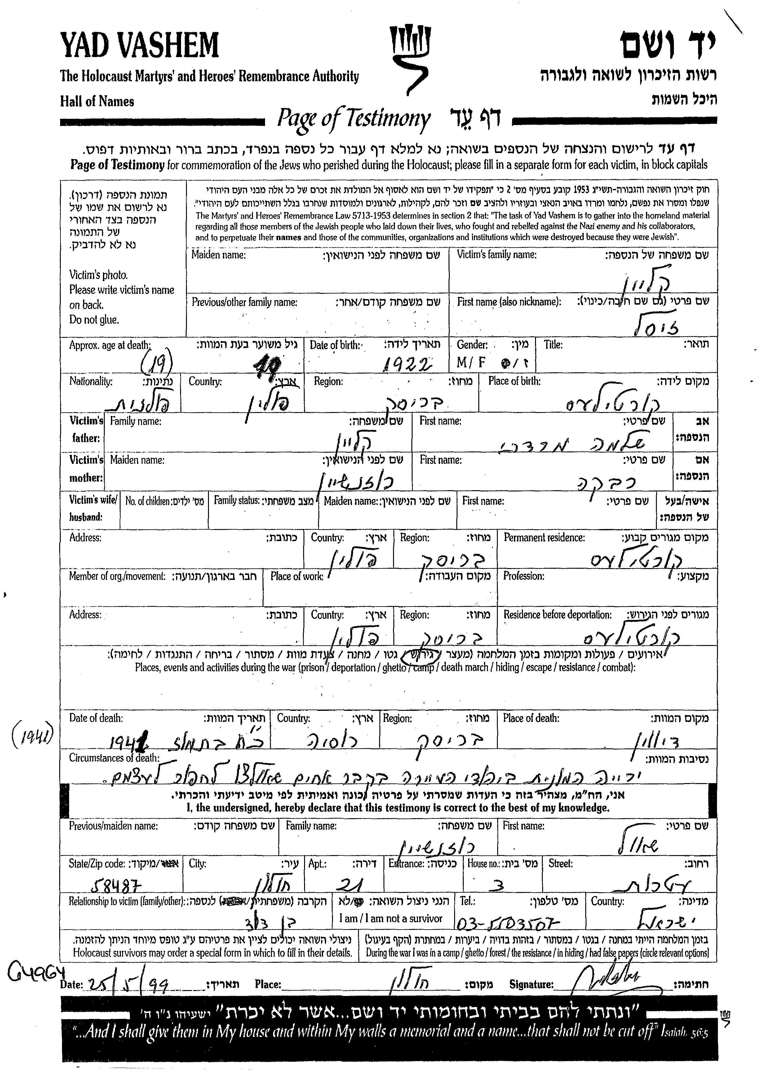 Zysl Klein was born in Kortelisi, Poland, 1922 to Shlomo Mordekhai and Rivka. He was single. Prior to WWII he lived in Kortelisi, Poland. During the war he was in Kortelisi, Poland. Zysl was murdered in the Shoah. Place of death: Divin, Poland, 1941.