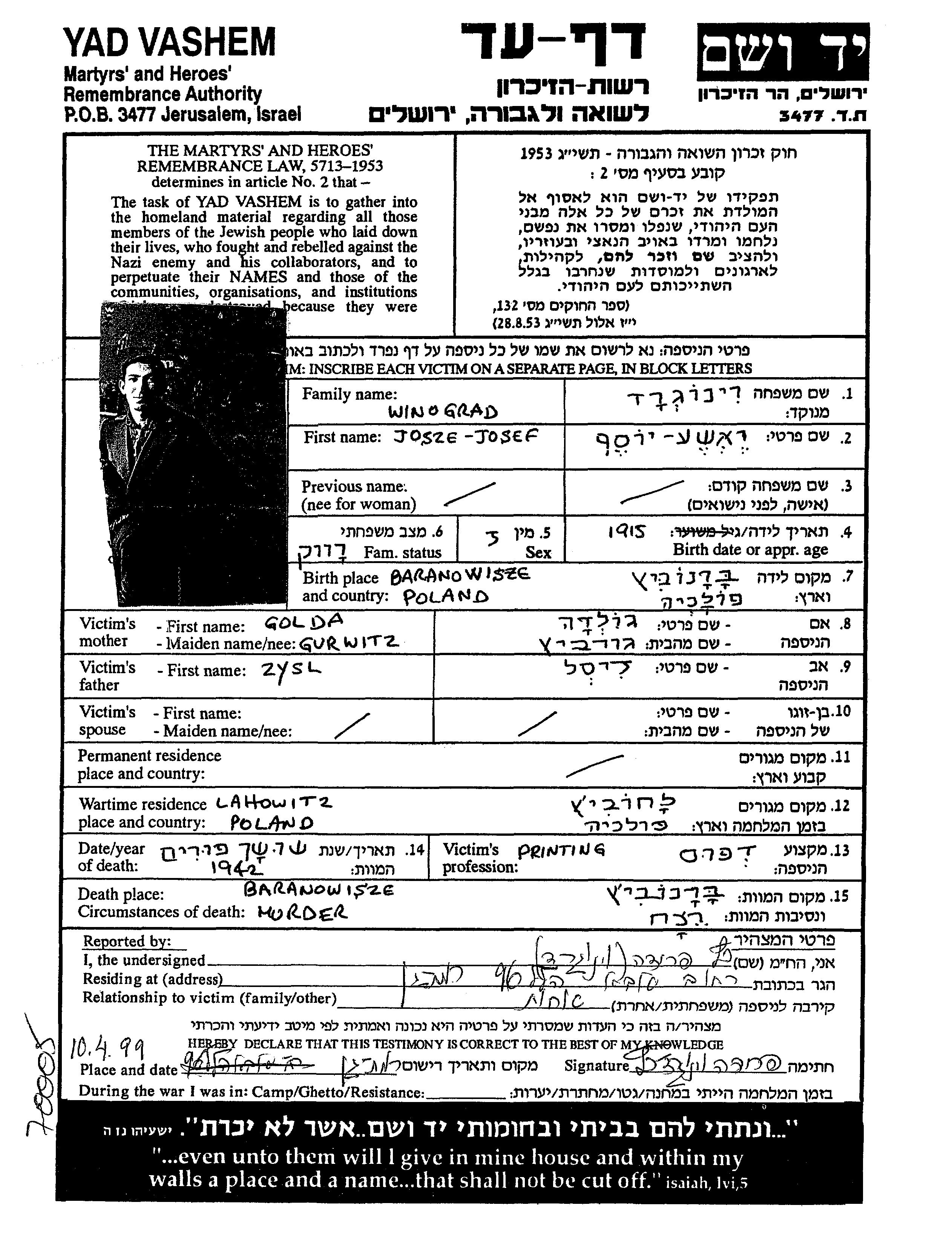 Winograd Josze Josef Iahse 1915 unstated place, Page of Testimony