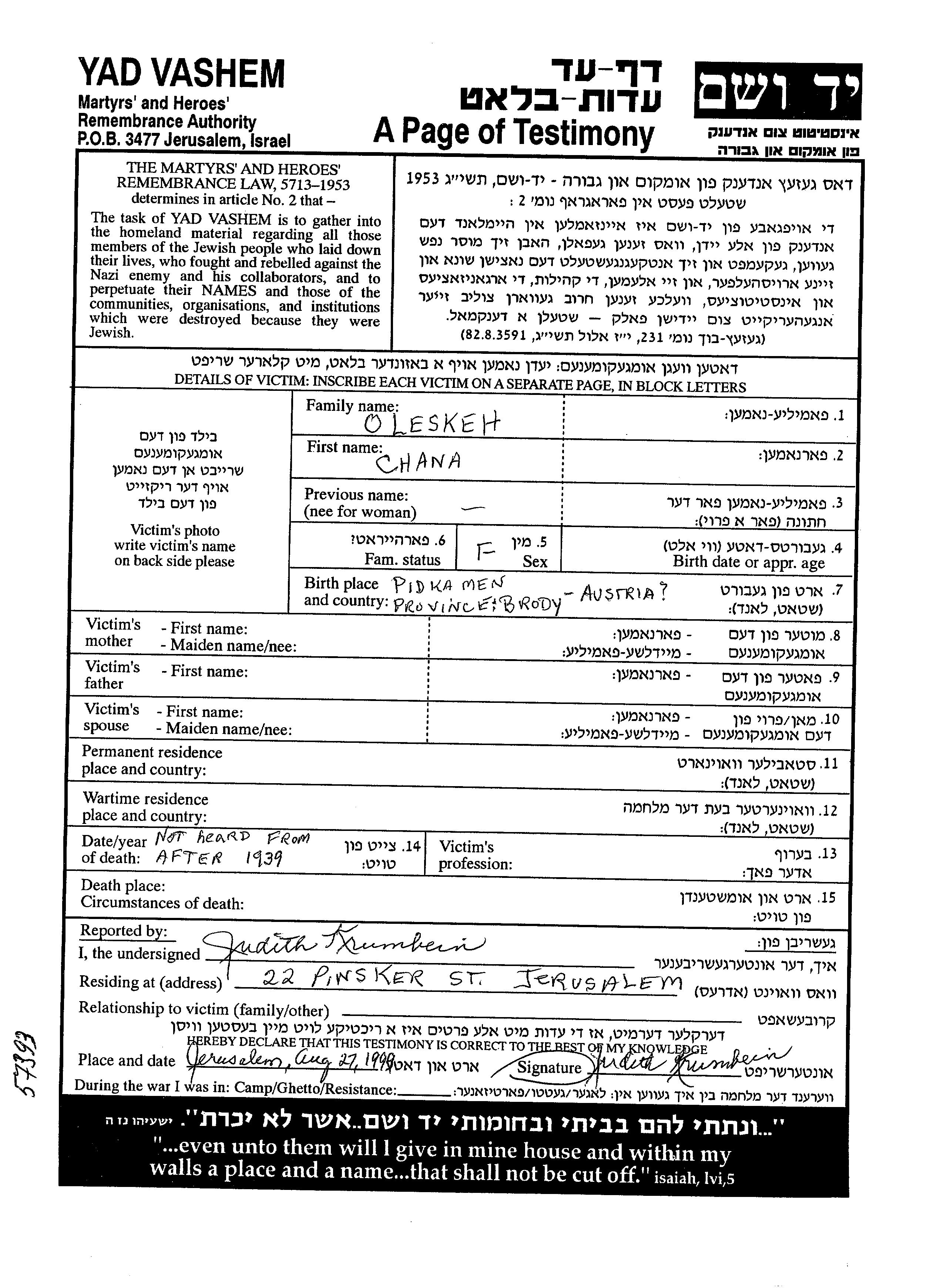 Yad Vashem - Pages of Testimony Names Memorial Collection