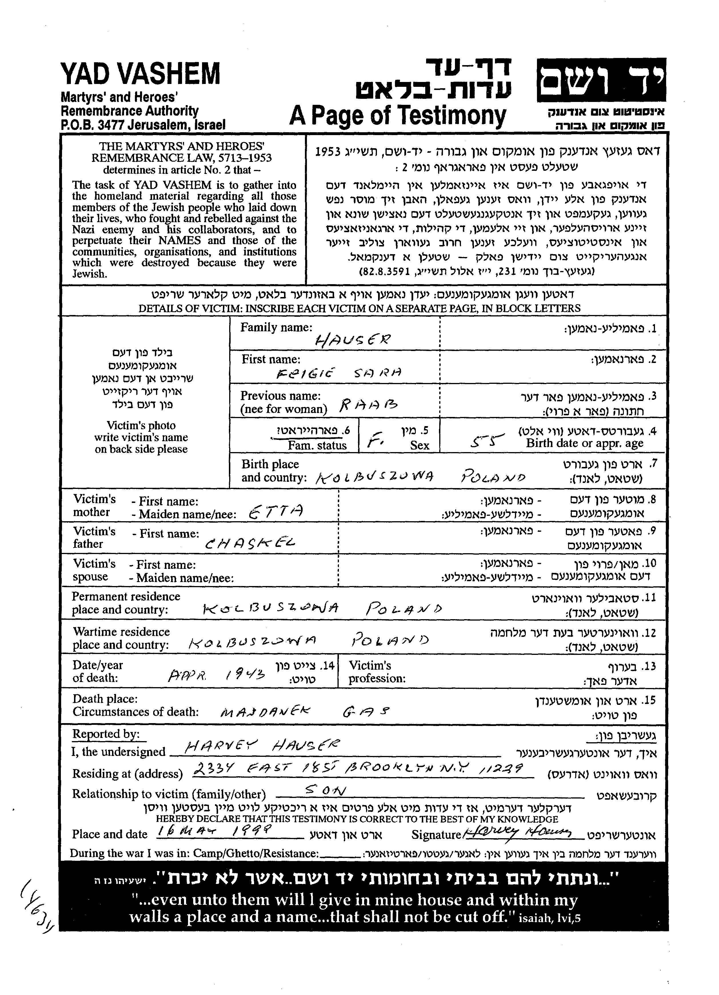 Feigie Sara Hoizer nee Rab was born in Kolbuszowa, Poland to Chaskel and Etta. She was married. Prior to WWII she lived in Kolbuszowa, Poland. During the war she was in Kolbuszowa, Poland. Feigie Sara was murdered in the Shoah. Place of death: Majdanek, Poland, 1943.