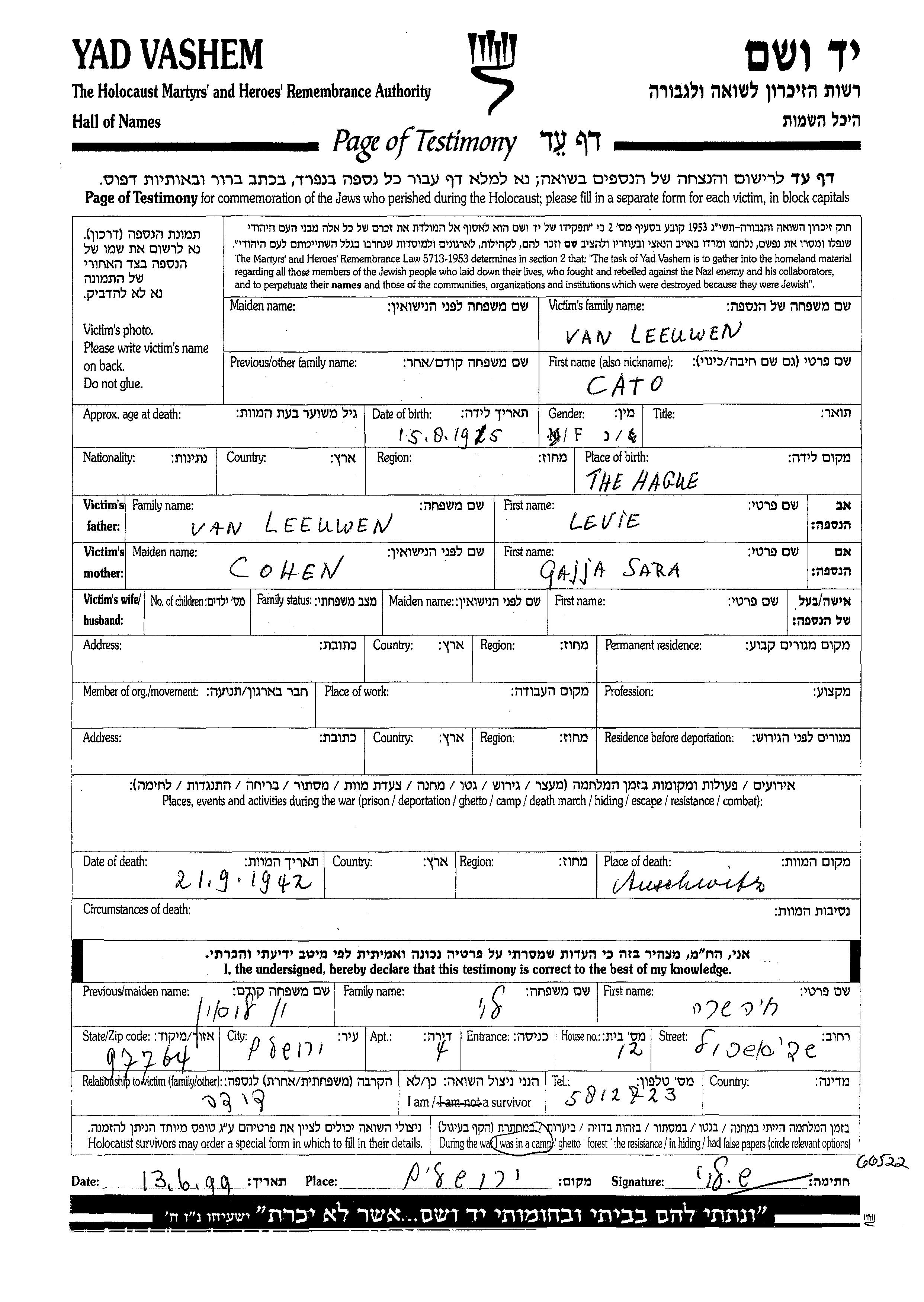 Cato van Leeuwen was born in The Hague, The Netherlands, 1915 to Levie and Gajja Sara. Prior to WWII she lived in unstated place.
