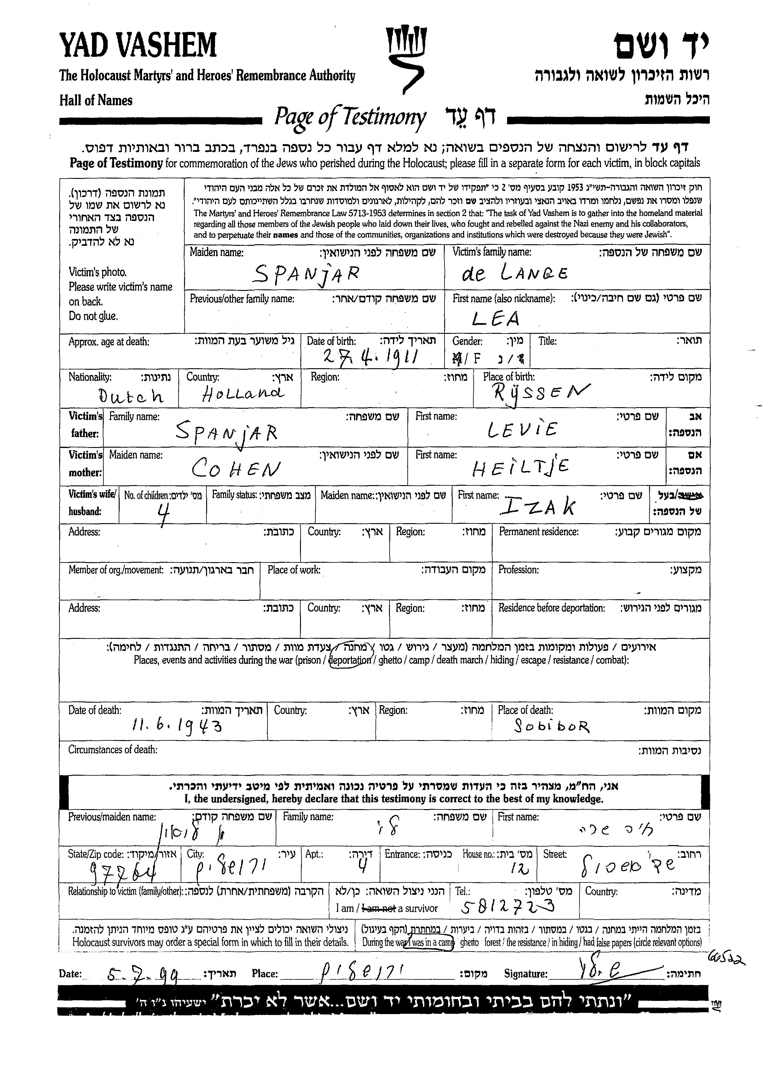 Lea Lange de nee Spanjar was born in Rijssen, The Netherlands, 1911 to Levie and Heiltje. She was married to Izak. Lea was murdered in the Shoah. Place of death: Sobibor, Poland, 1943.