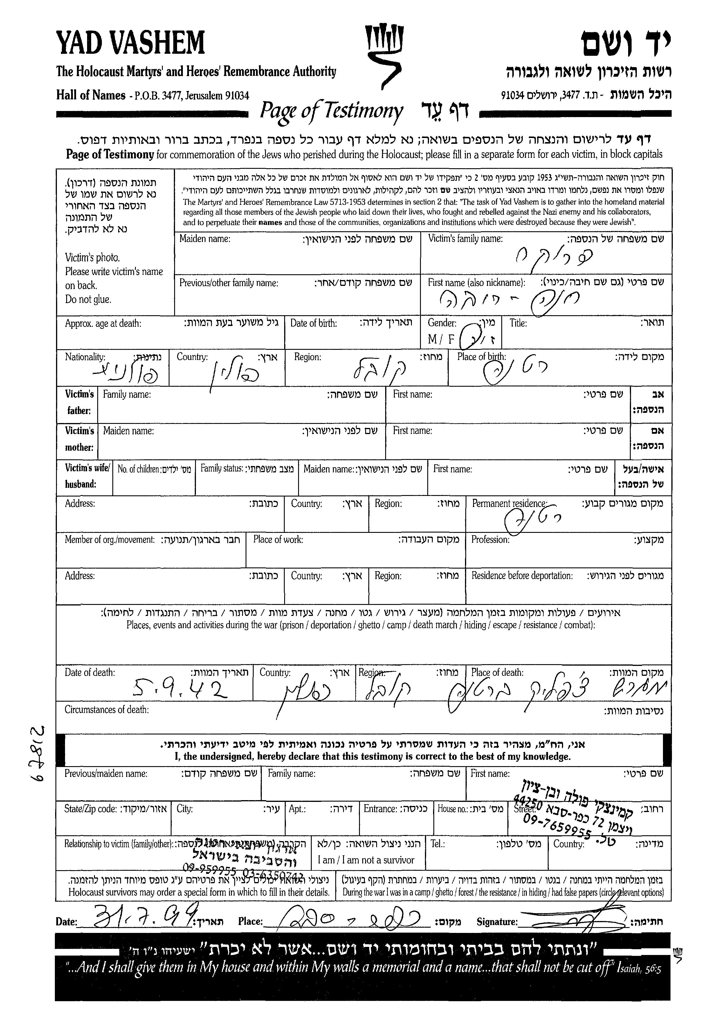 Yad Vashem - Pages of Testimony Names Memorial Collection