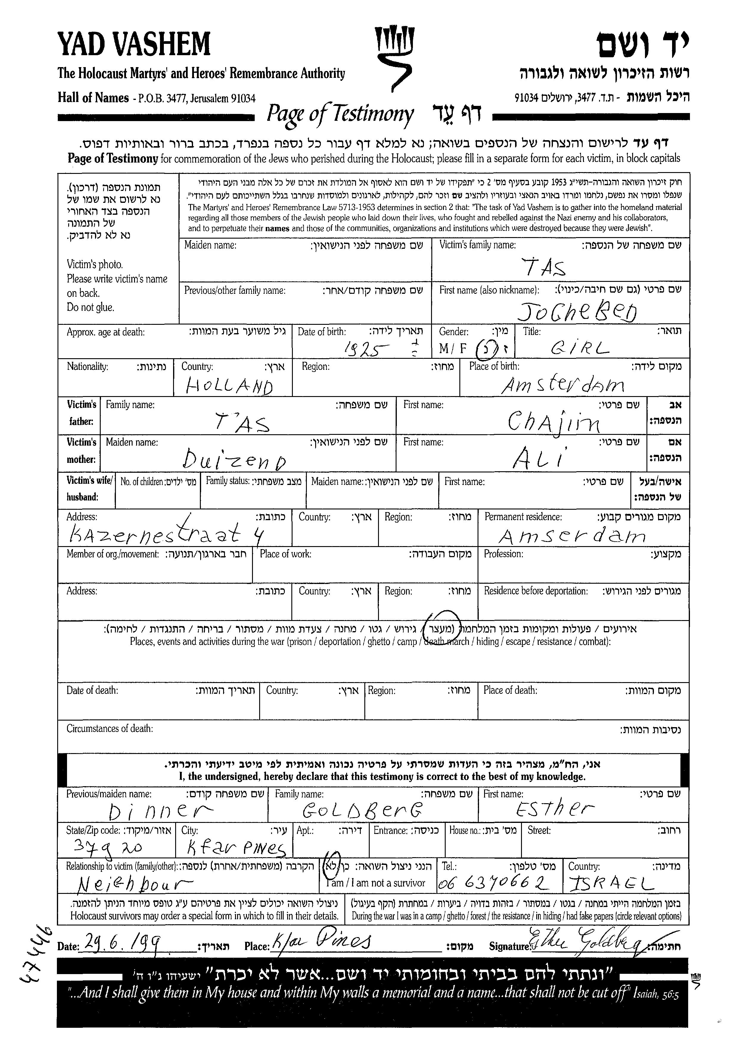 Jochebed Tas was born in Amsterdam, The Netherlands, 1925 to Chajim and Ali. She was child. Prior to WWII she lived in Amsterdam, The Netherlands. Jochebed was murdered in the Shoah.