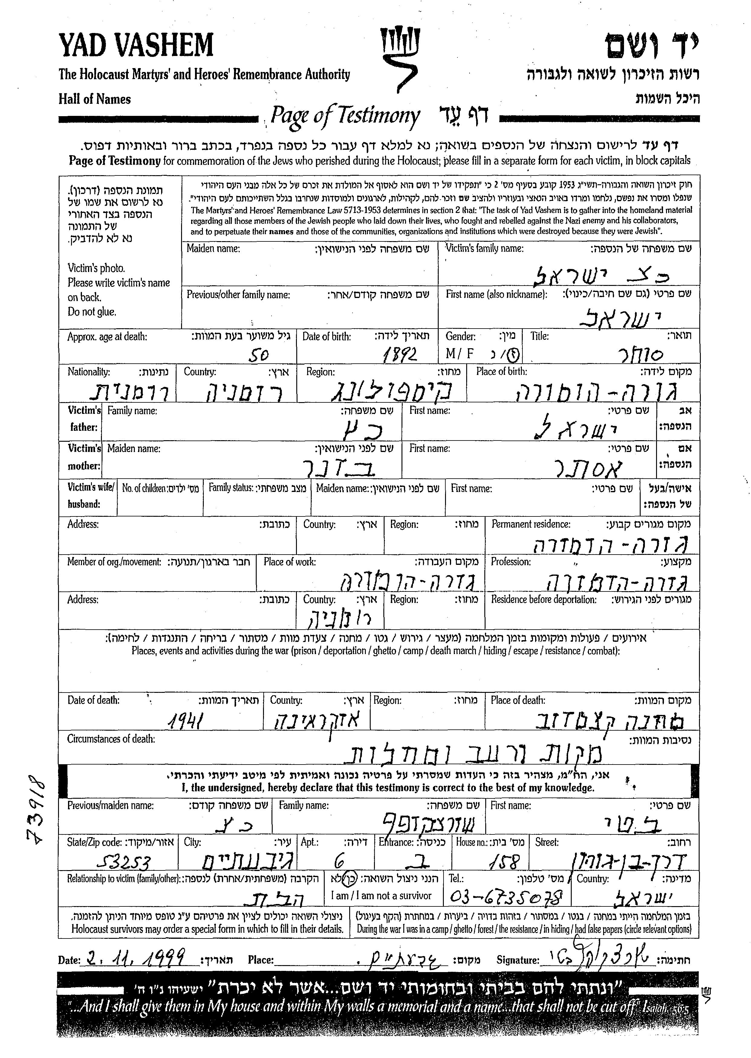 Yisrael Katz was born in Gura Humora, Romania, 1892 to Yisrael and Ester. He was a merchant. Prior to WWII he lived in Gura Humora, Romania. During the war he was in Gura Humora, Romania. Yisrael was murdered in the Shoah. Place of death: Camp, Ukraine (USSR), 1941.