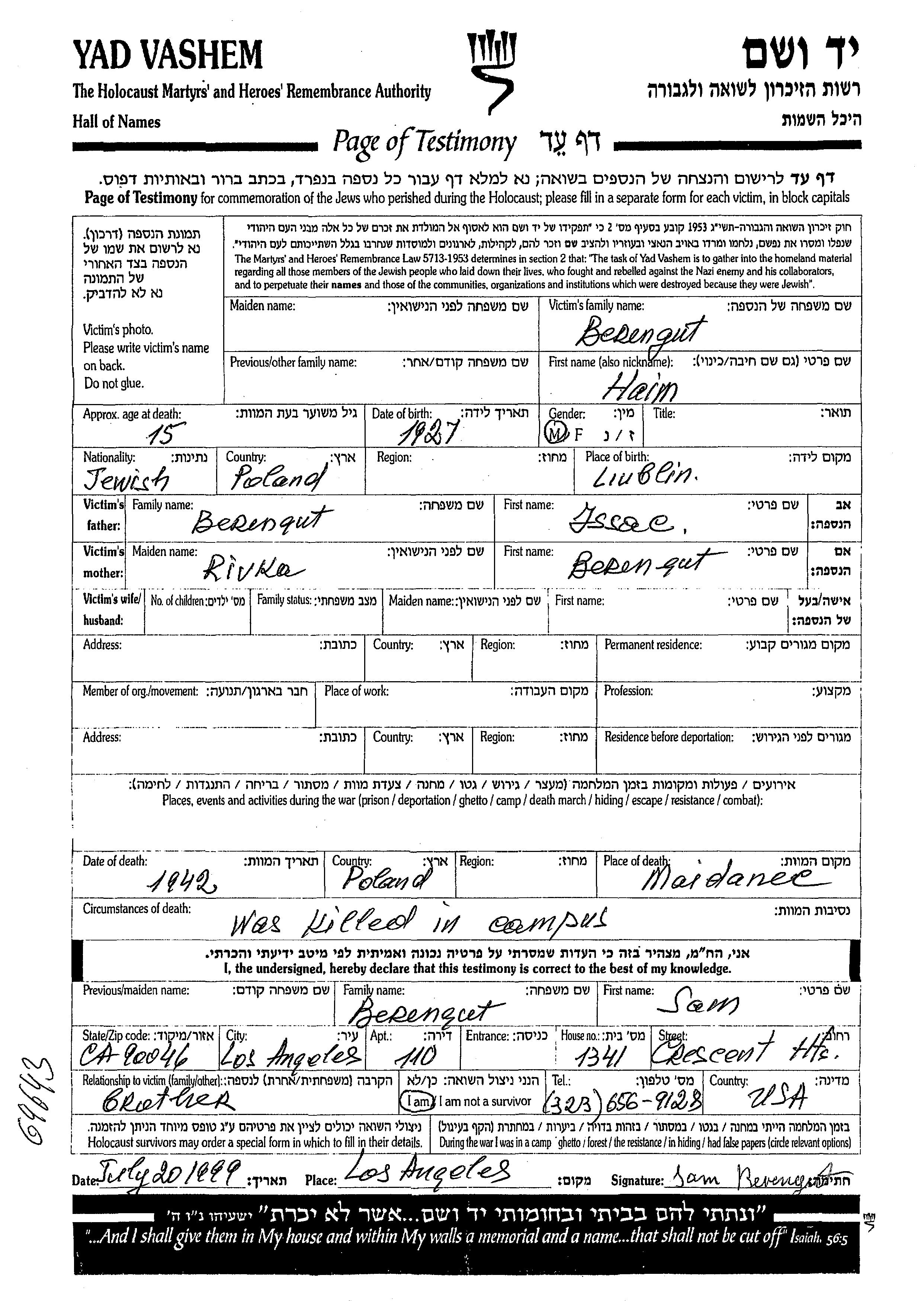 Yad Vashem - Pages of Testimony Names Memorial Collection