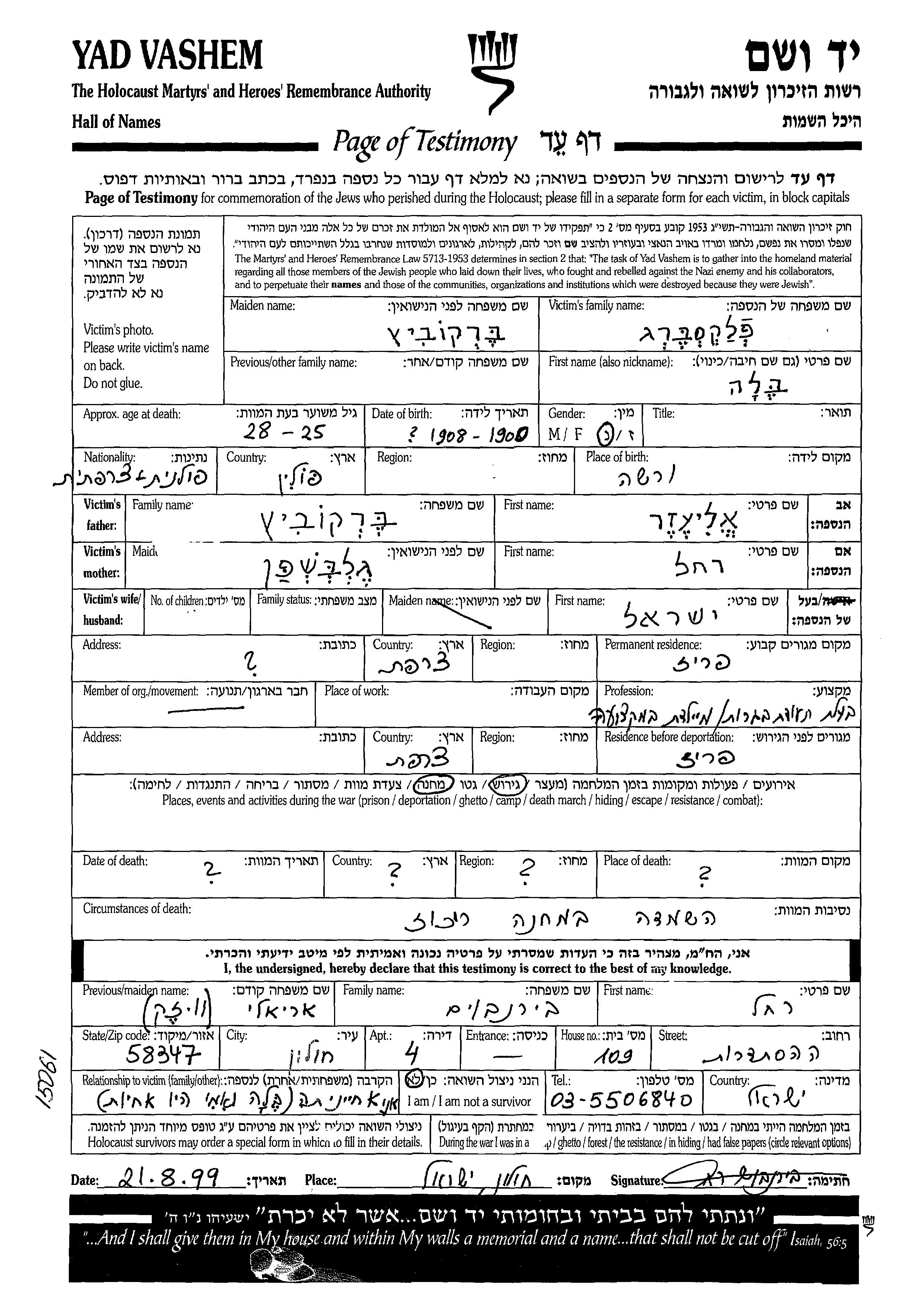 Yad Vashem - Pages of Testimony Names Memorial Collection