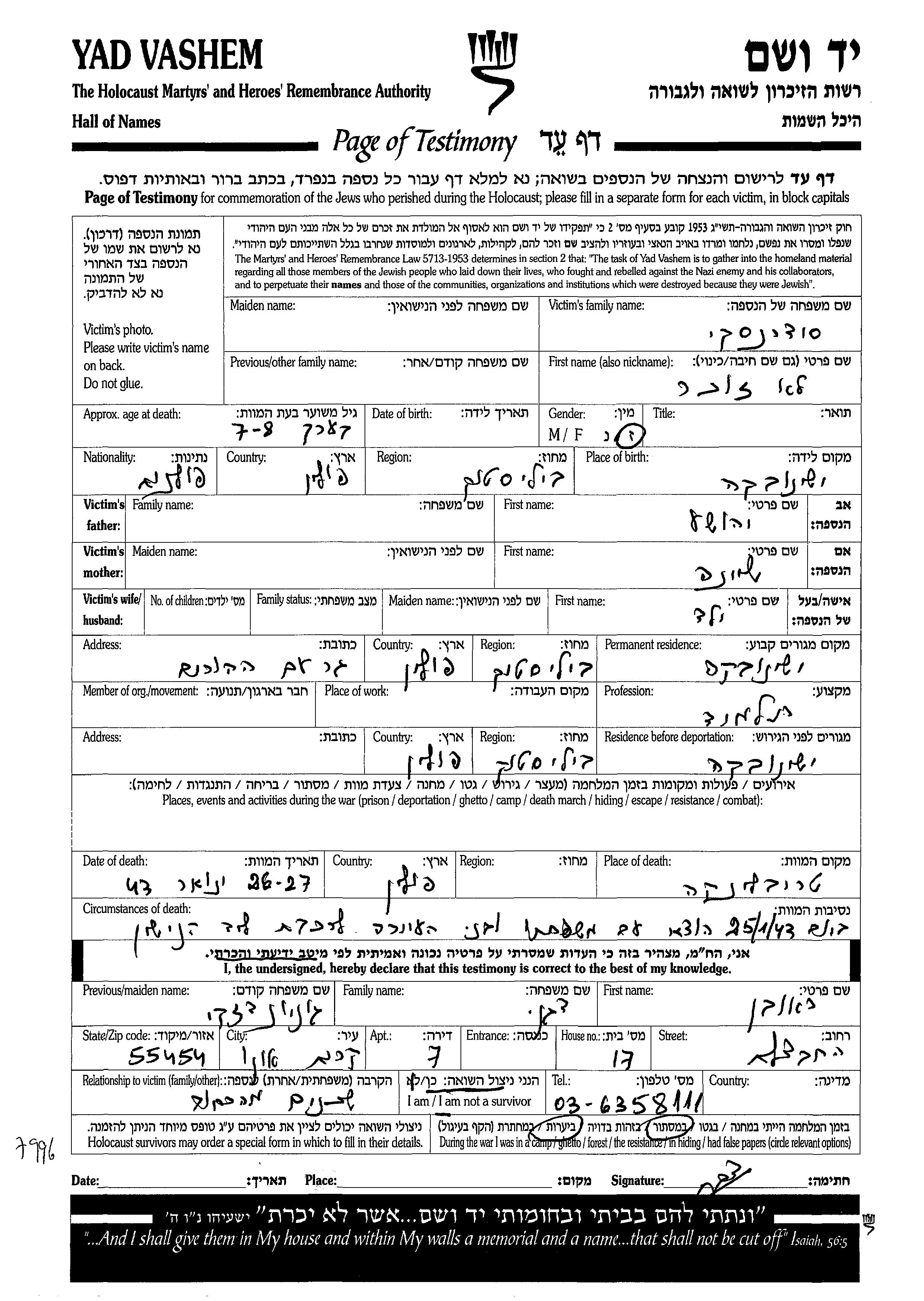 Yad Vashem - Pages of Testimony Names Memorial Collection