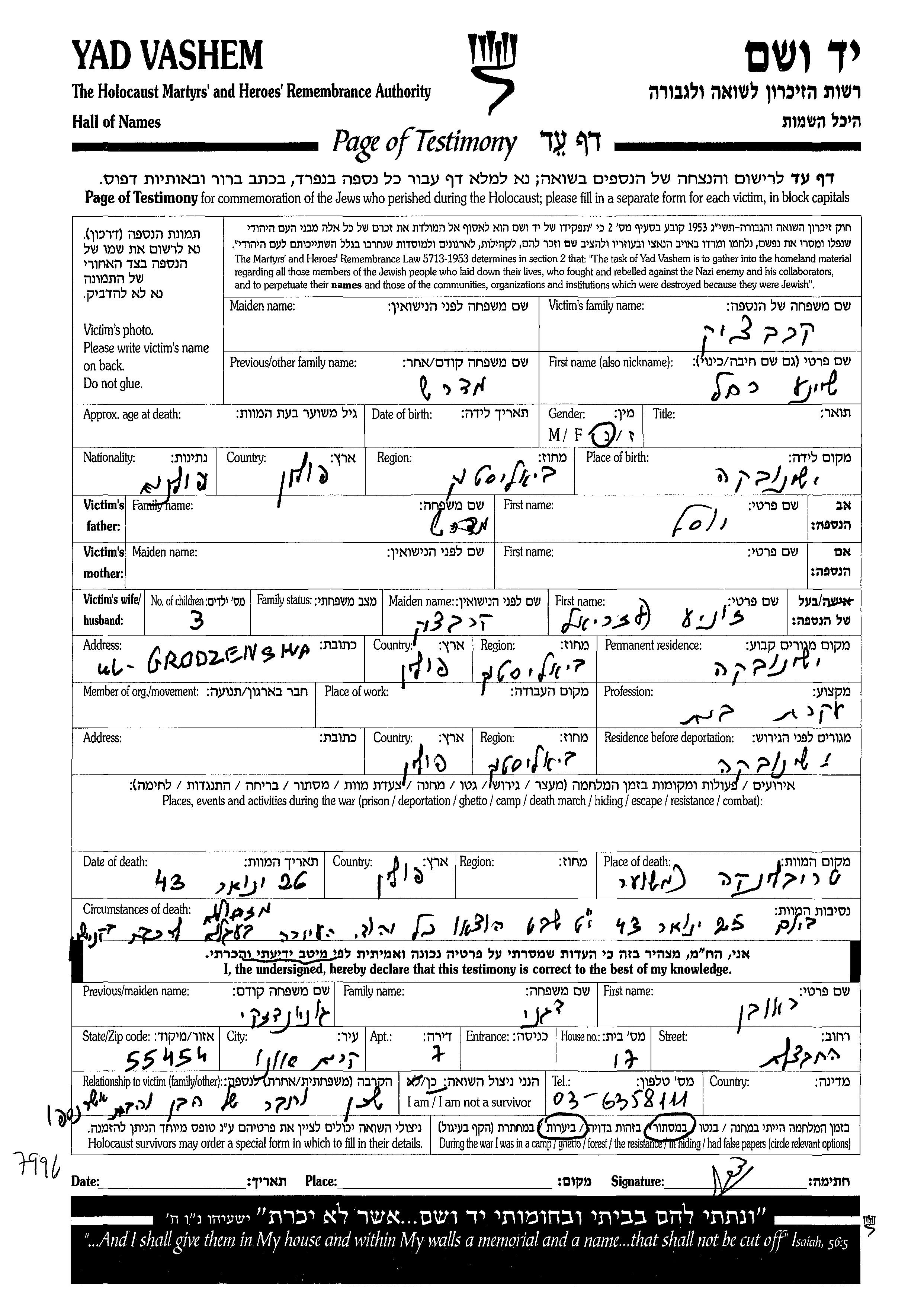 Yad Vashem - Pages of Testimony Names Memorial Collection