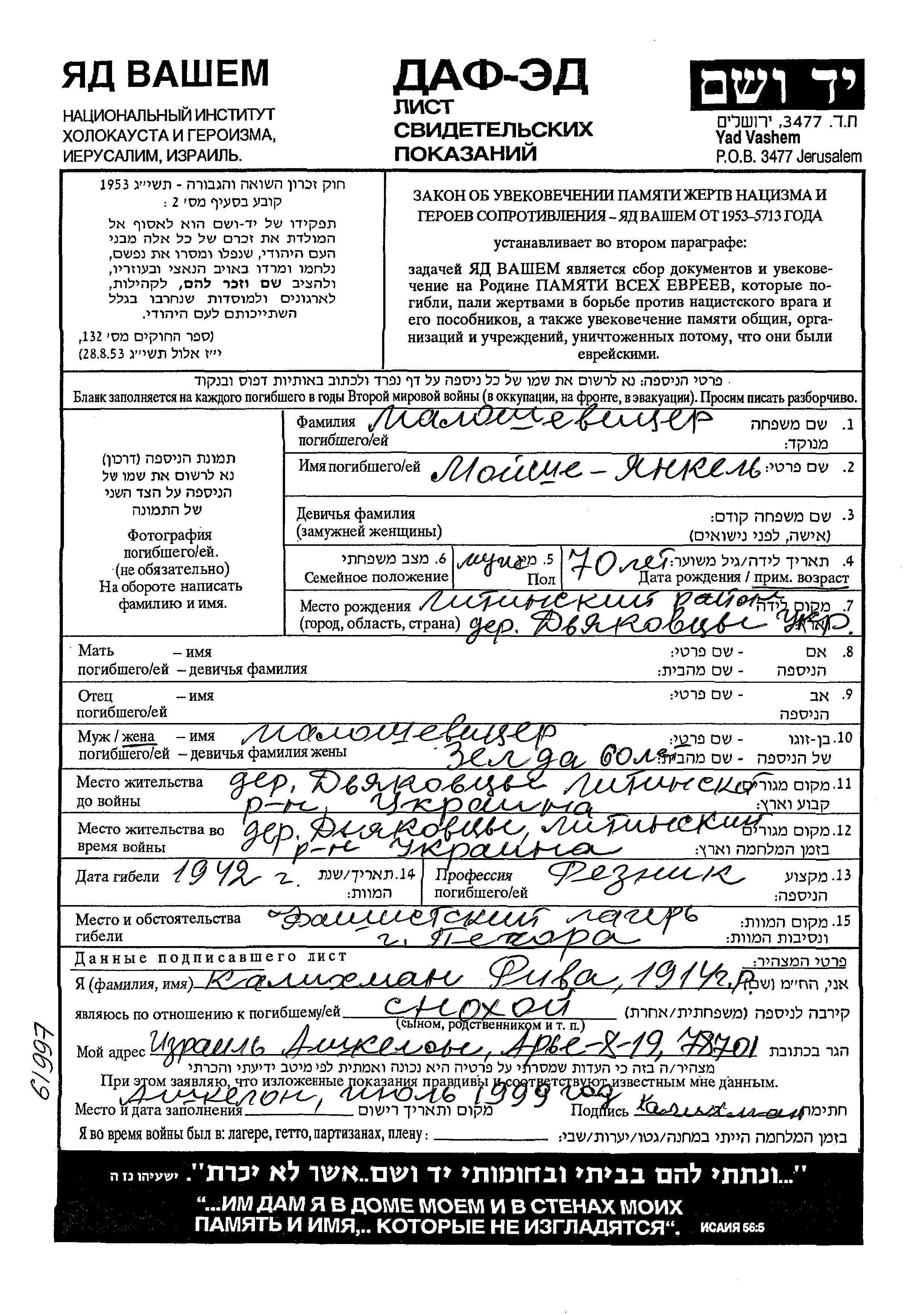Moishe Jankel Maloshevitzer was born in Dyakovtsy, Ukraine (USSR). He was a ritual slaughterer and married to Zelda. Prior to WWII he lived in Dyakovtsy, Ukraine (USSR). During the war he was in Dyakovtsy, Ukraine (USSR). Moishe Jankel was murdered in the Shoah. Place of death: Pechora, Ukraine (USSR), 1942.