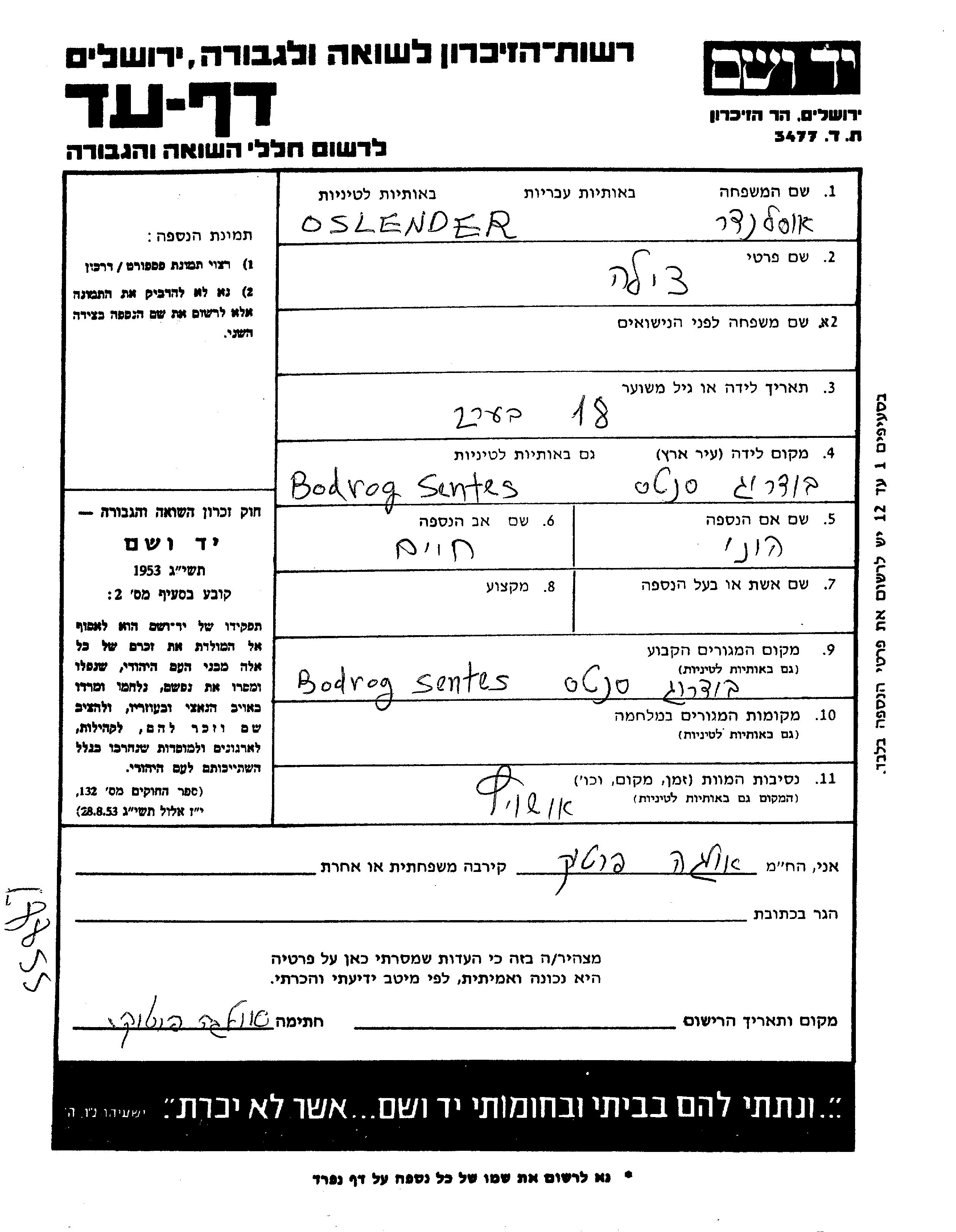 Oslender Tzila Bodrogszentes, Czechoslovakia Page of Testimony