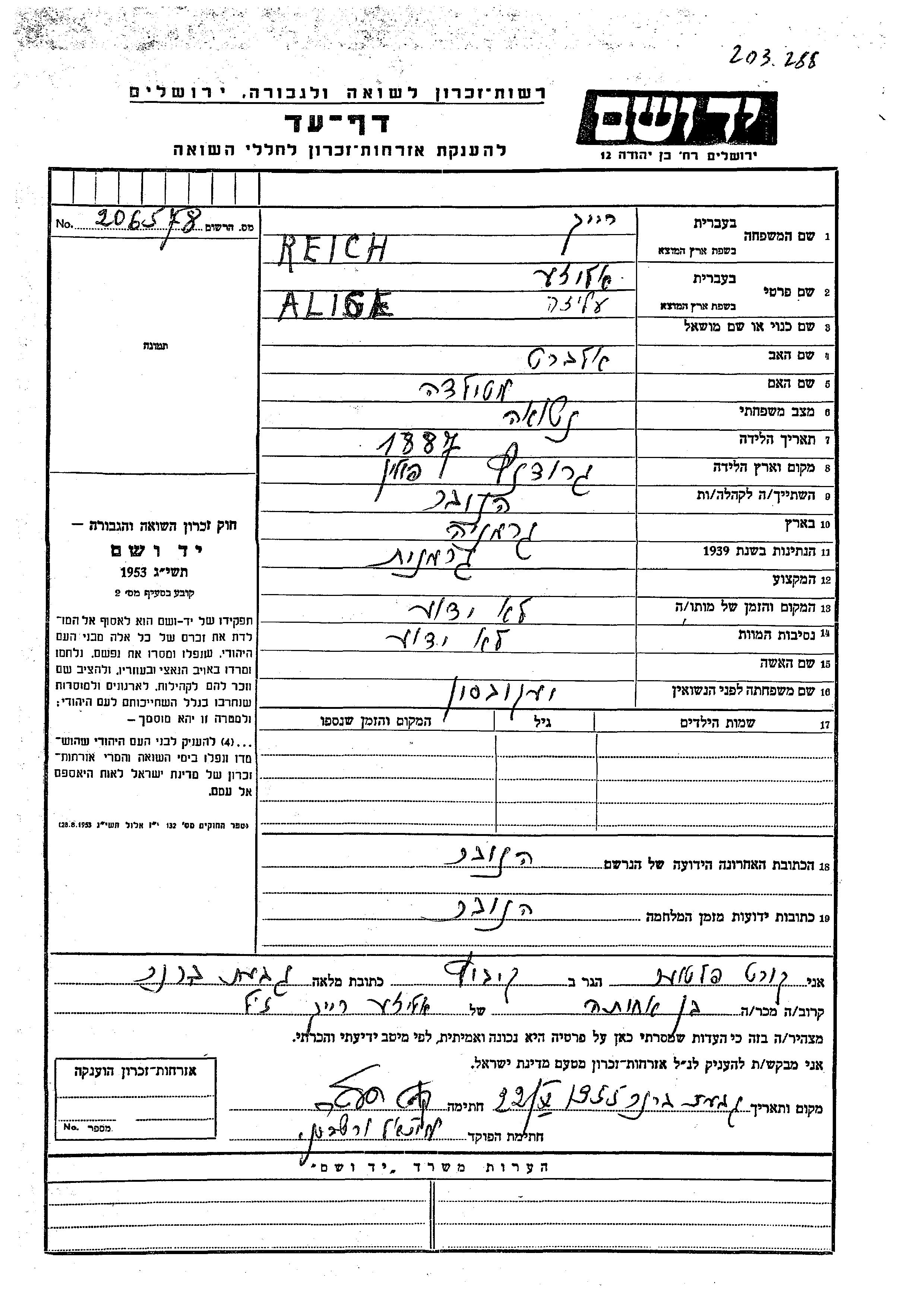 Alice Aliza Reich nee Iakobson was born in Grudziadz, Poland, 1887 to Albert and Matilda. She was married. Prior to WWII she lived in Hannover, Germany. During the war she was in Hannover, Germany. Alice Aliza was murdered in the Shoah.
