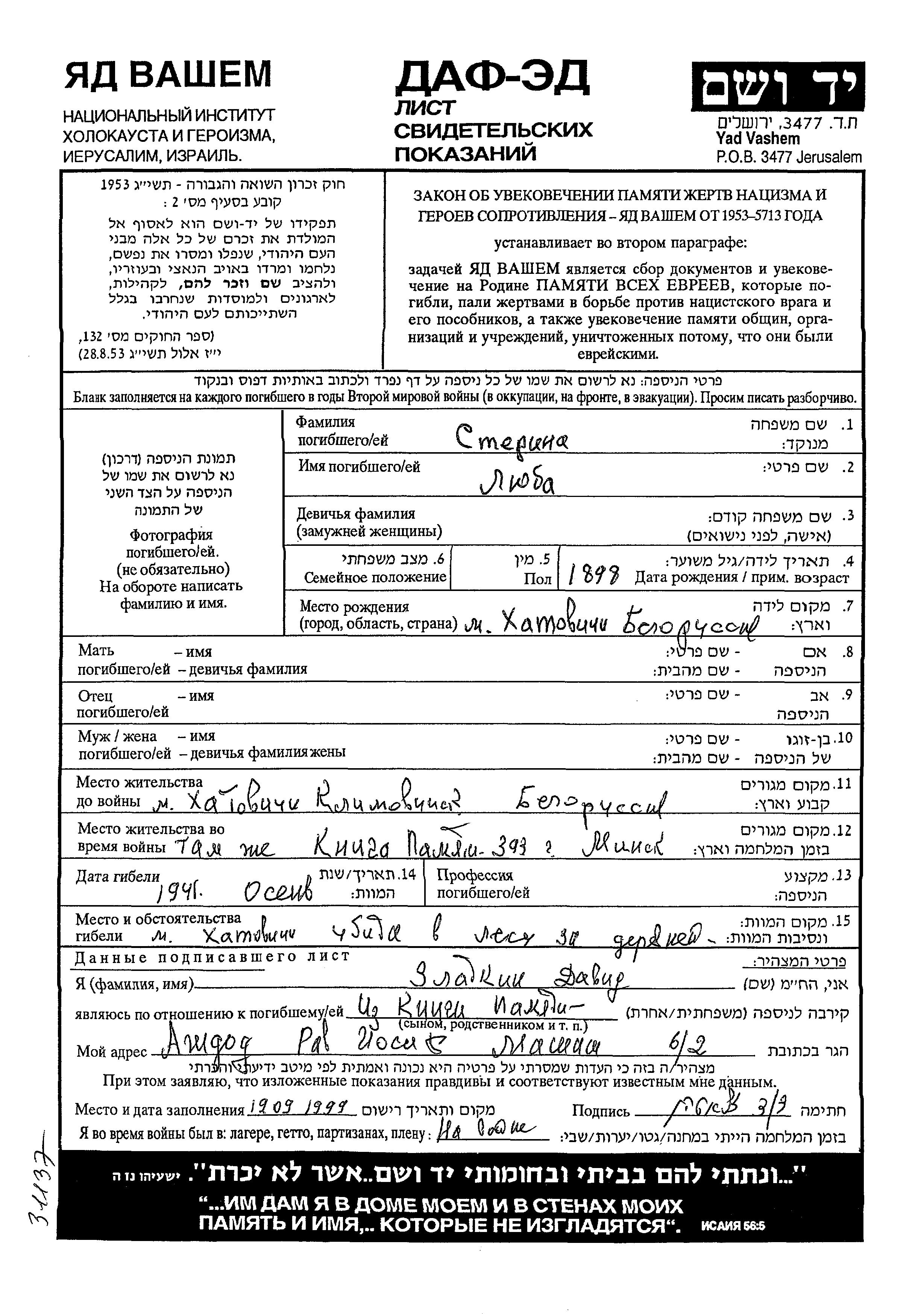 Lyuba Sterin was born in Khatovichi, Belorussia (USSR), 1898. Prior to WWII she lived in Khatovichi, Belorussia (USSR). During the war she was in Khatovichi, Belorussia (USSR). Lyuba was murdered in the Shoah. Place of death: Khatovichi, Belorussia (USSR), 1941.
