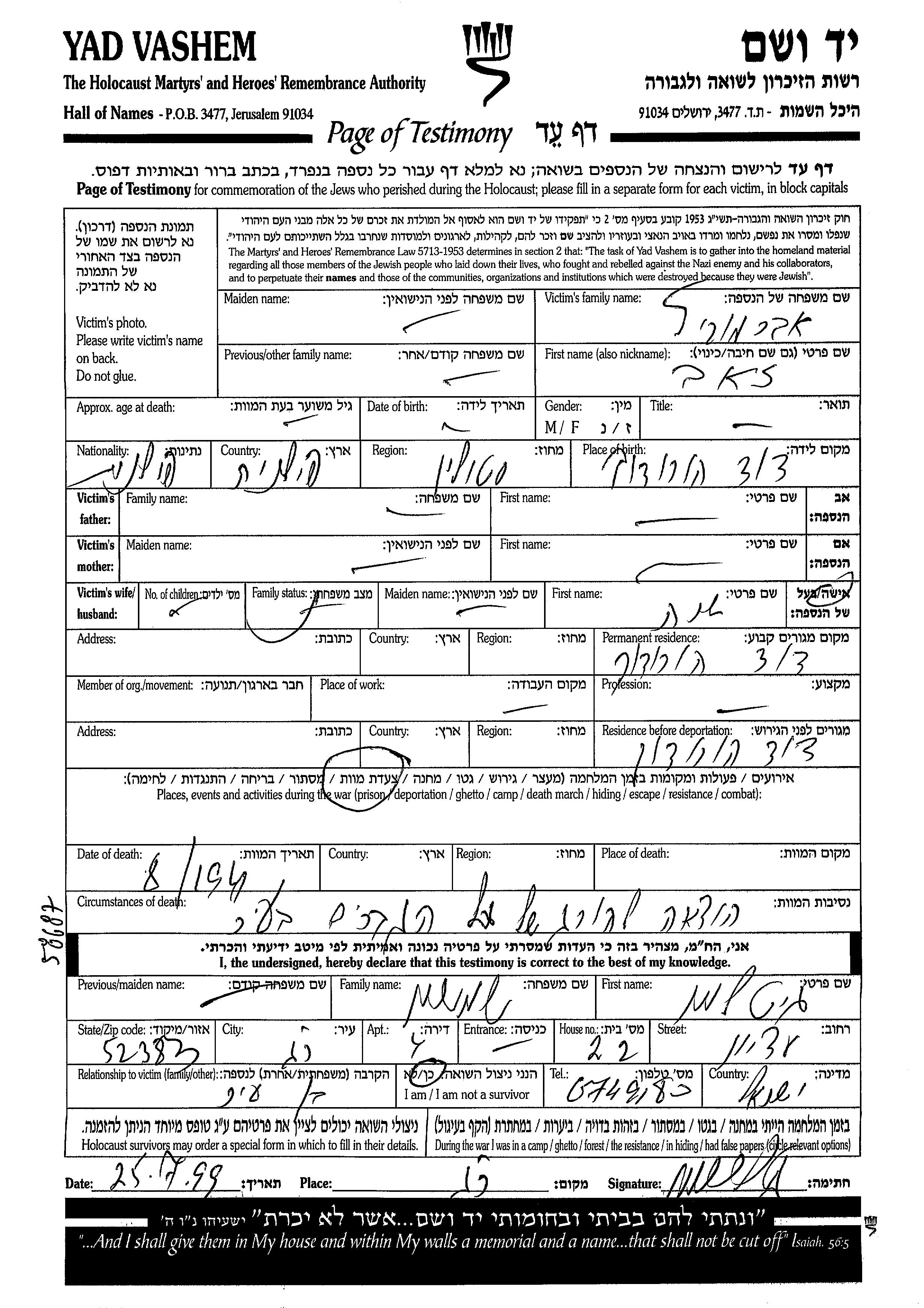 Zeev Abramovitz was born in David Horodok, Poland. He was married to Sara. Prior to WWII he lived in David Horodok, Poland. During the war he was in David Horodok, Poland. Zeev was murdered in the Shoah. Place of death: David Horodok, Poland, 1941.