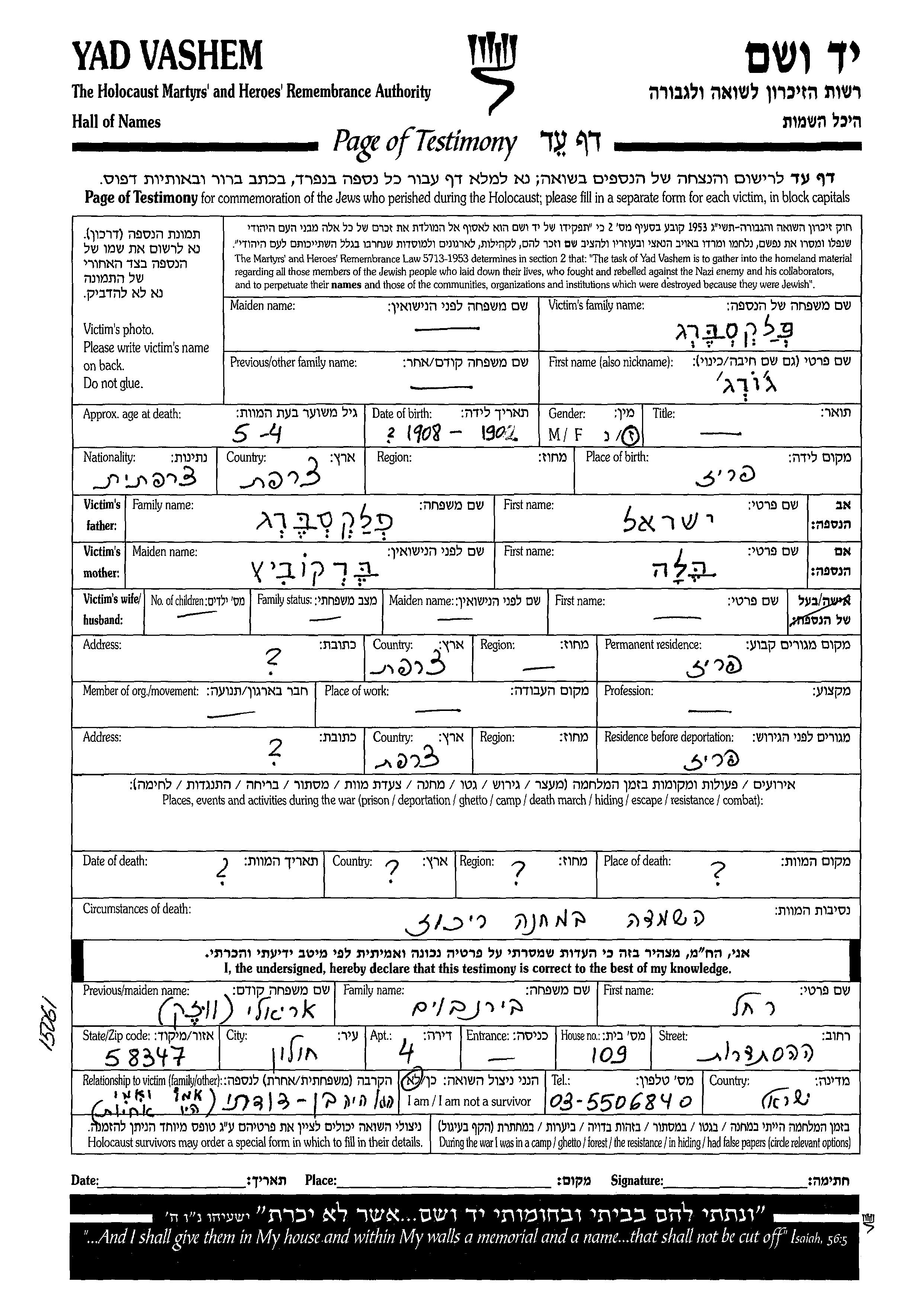 Yad Vashem - Pages of Testimony Names Memorial Collection