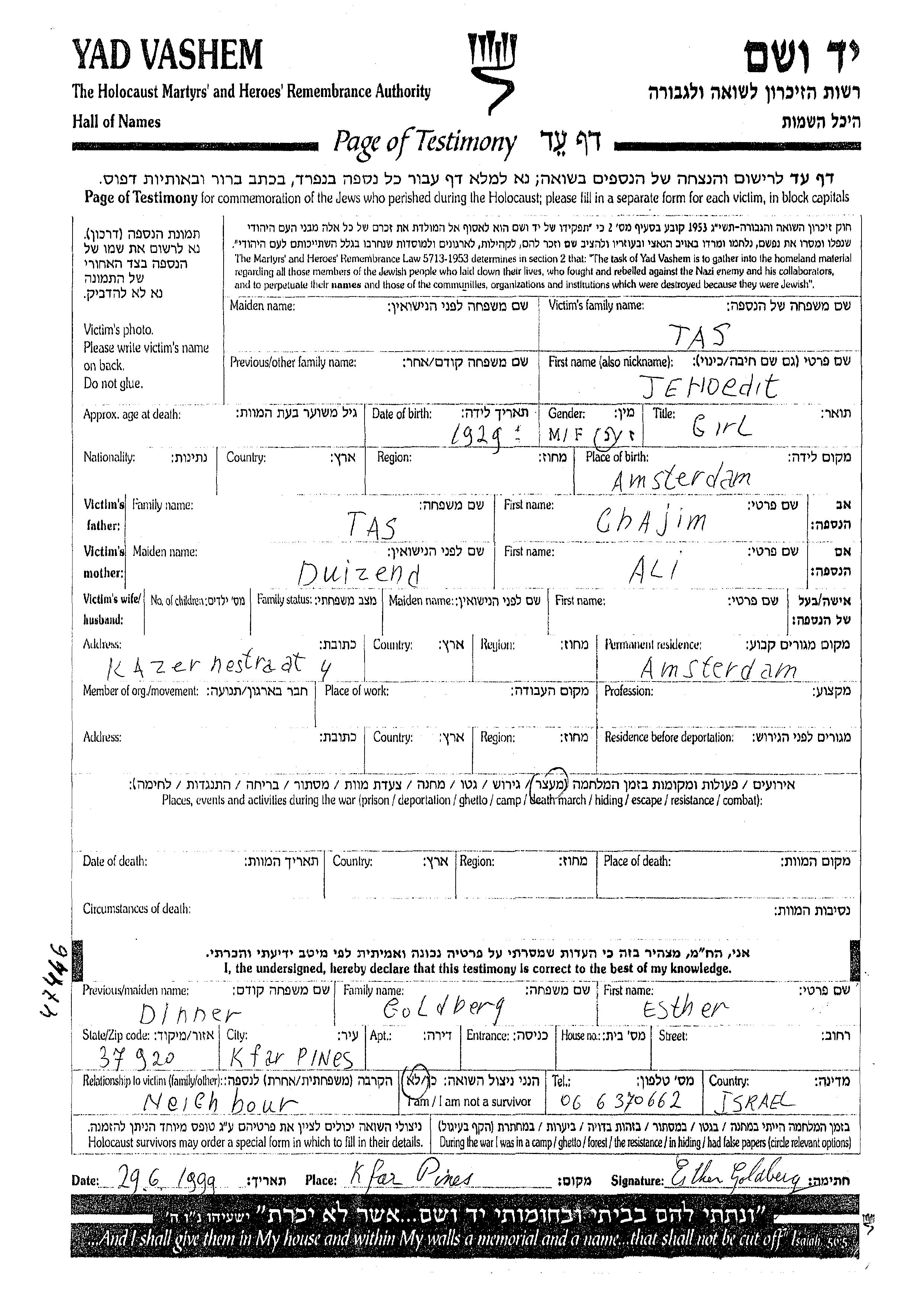 Jehoedit Tas was born in Amsterdam, The Netherlands, 1929 to Chajim and Ali. She was child. Prior to WWII she lived in Amsterdam, The Netherlands. Jehoedit was murdered in the Shoah.
