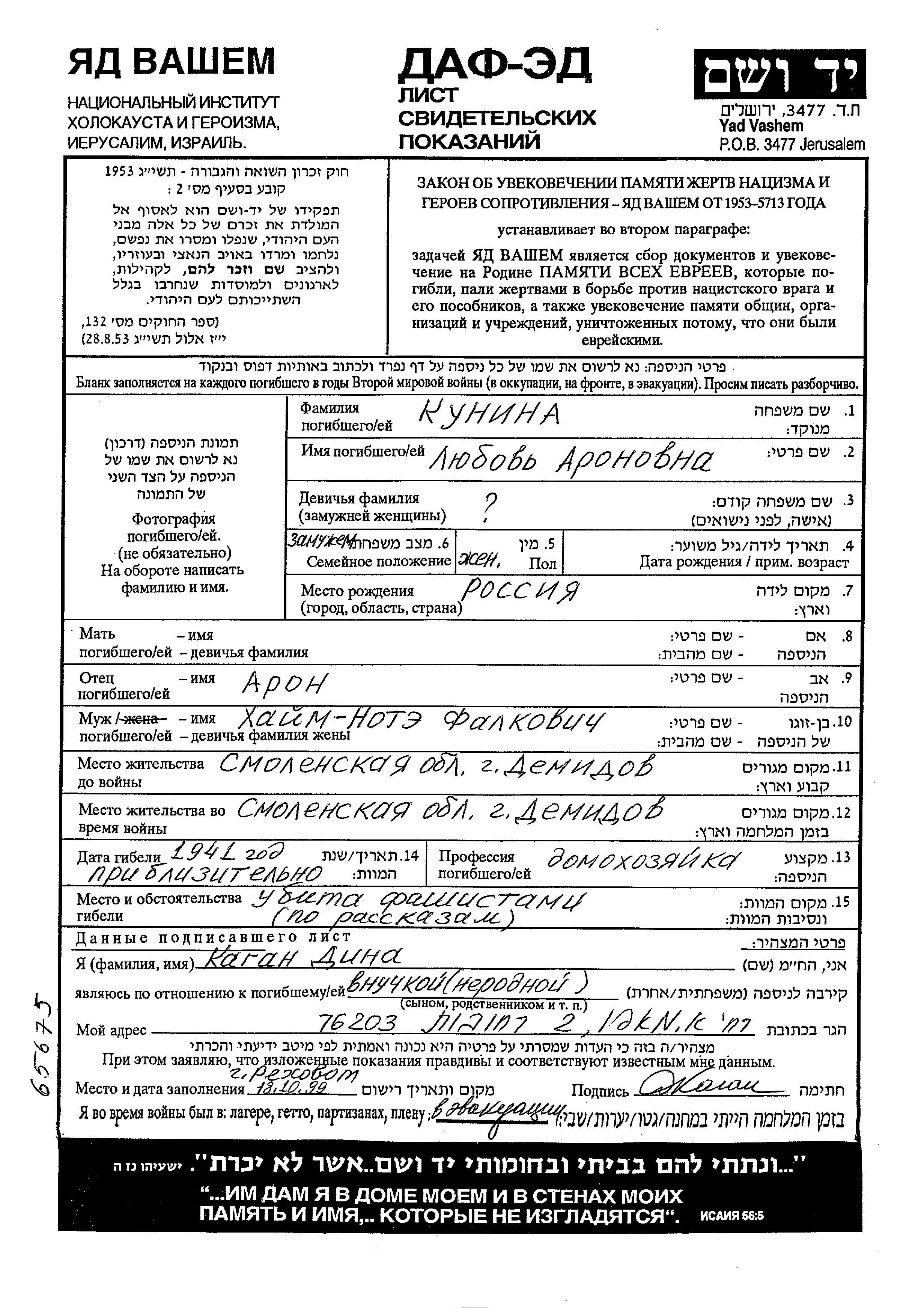 Lyubov Kunin was born in Russia (USSR) to Aron. She was a housewife and married to Khaim Note. Prior to WWII she lived in Demidov, Russia (USSR). During the war she was in Demidov, Russia (USSR). Lyubov was murdered in the Shoah. Place of death: unknown, 1941.