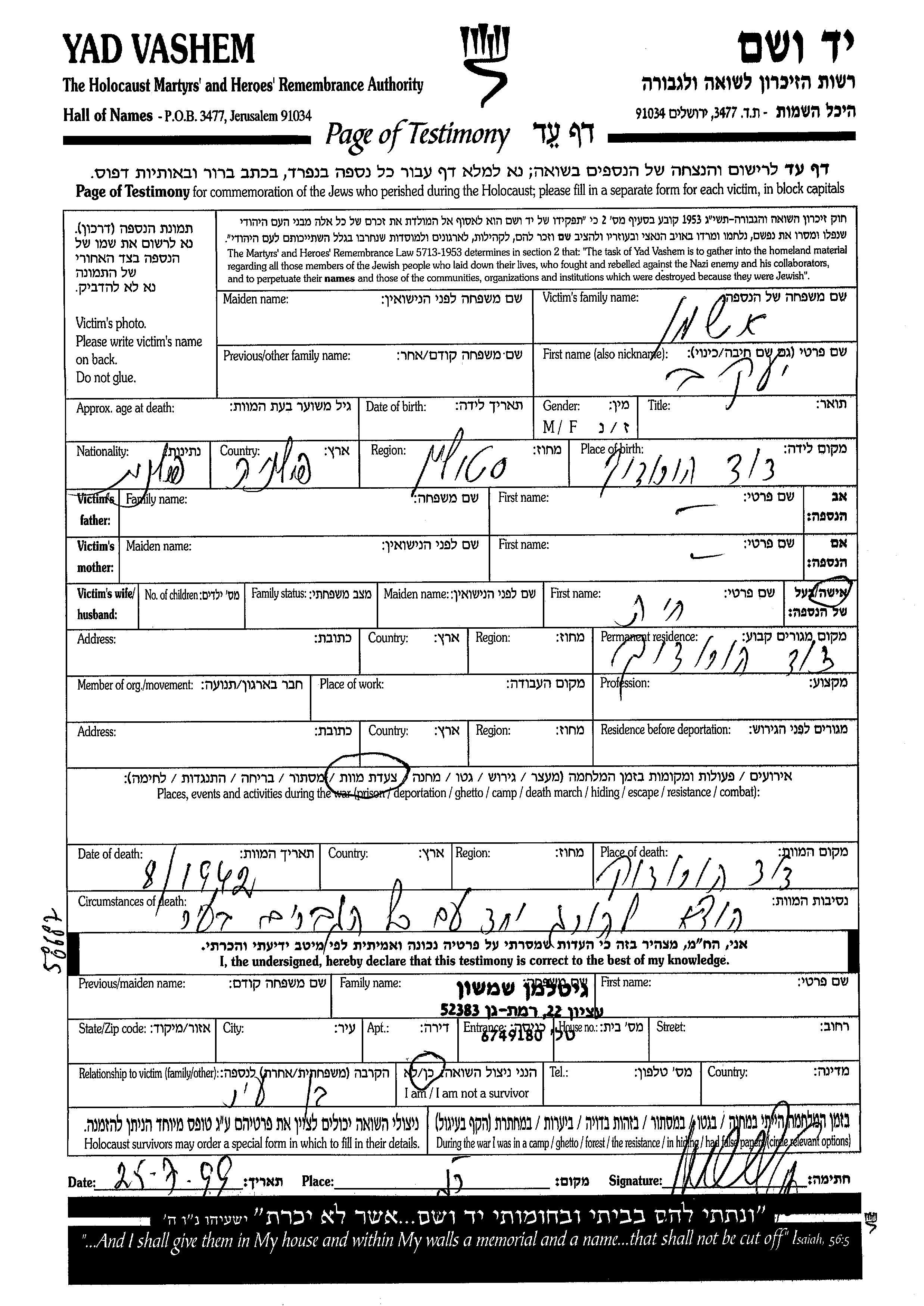 Yaakov Ashman was born in Dawid Grodek, Poland. He was married to Khaia. Prior to WWII he lived in Dawid Grodek, Poland. Yaakov was murdered in the Shoah. Place of death: Dawid Grodek, Poland, 1942.