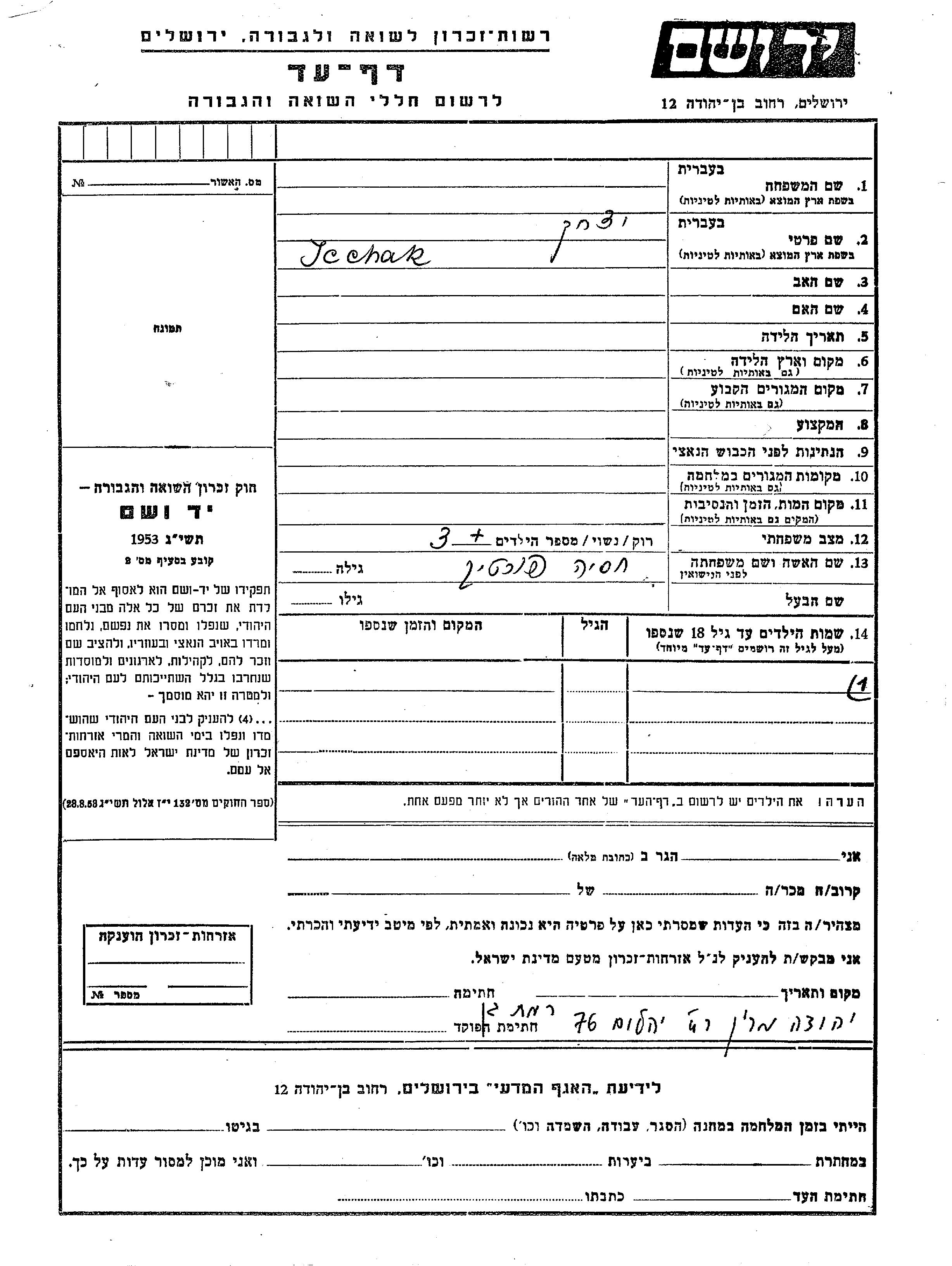 Surname unknown Ycchak unstated place, Page of Testimony