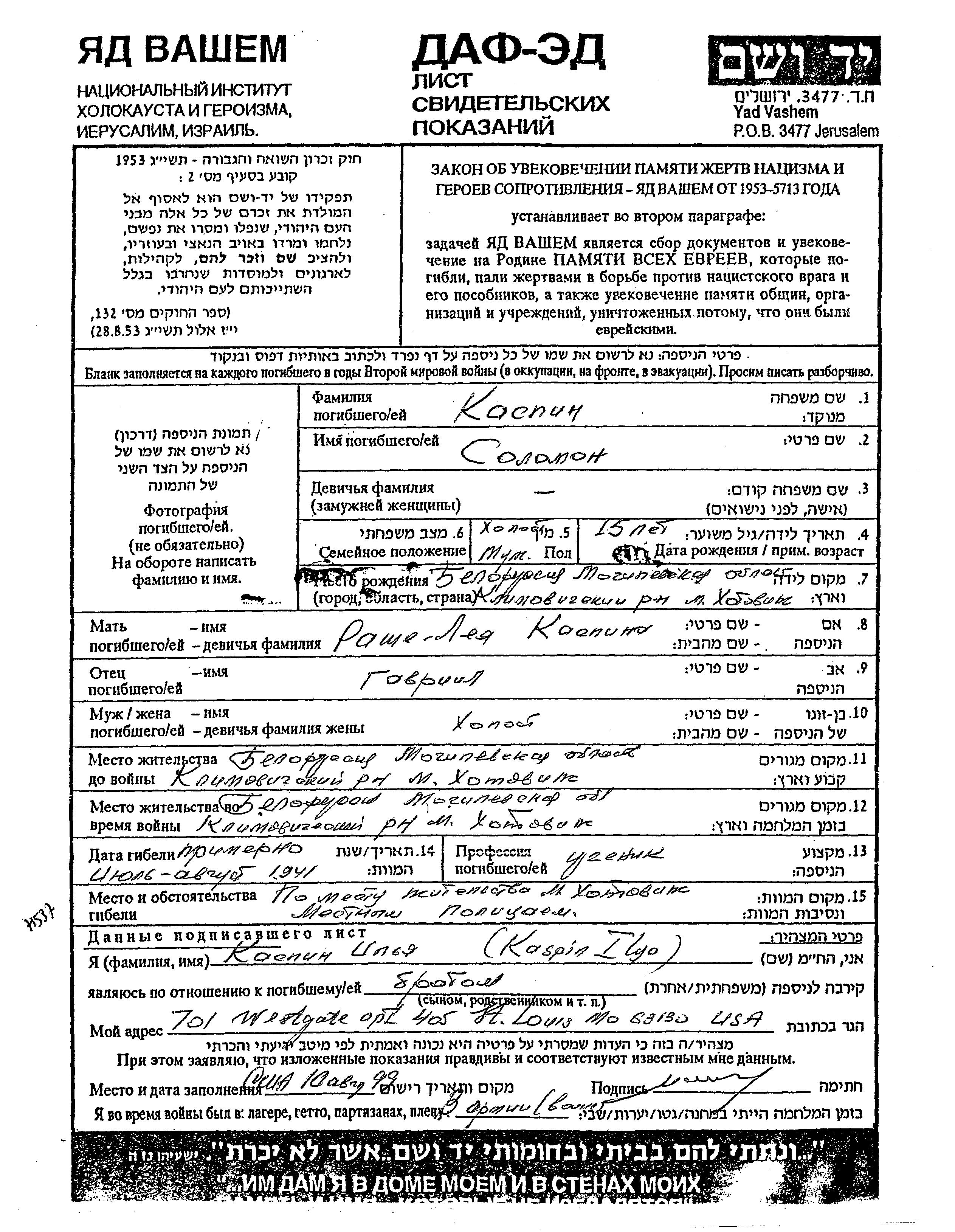 Solamon Kaspin was born in Khotovizh, Belorussia (USSR) to Gavriil and Rashe Leya. He was a pupil and single. Prior to WWII he lived in Khotovizh, Belorussia (USSR). During the war he was in Khotovizh, Belorussia (USSR). Solamon was murdered in the Shoah. Place of death: Khotovizh, Belorussia (USSR), 1941.