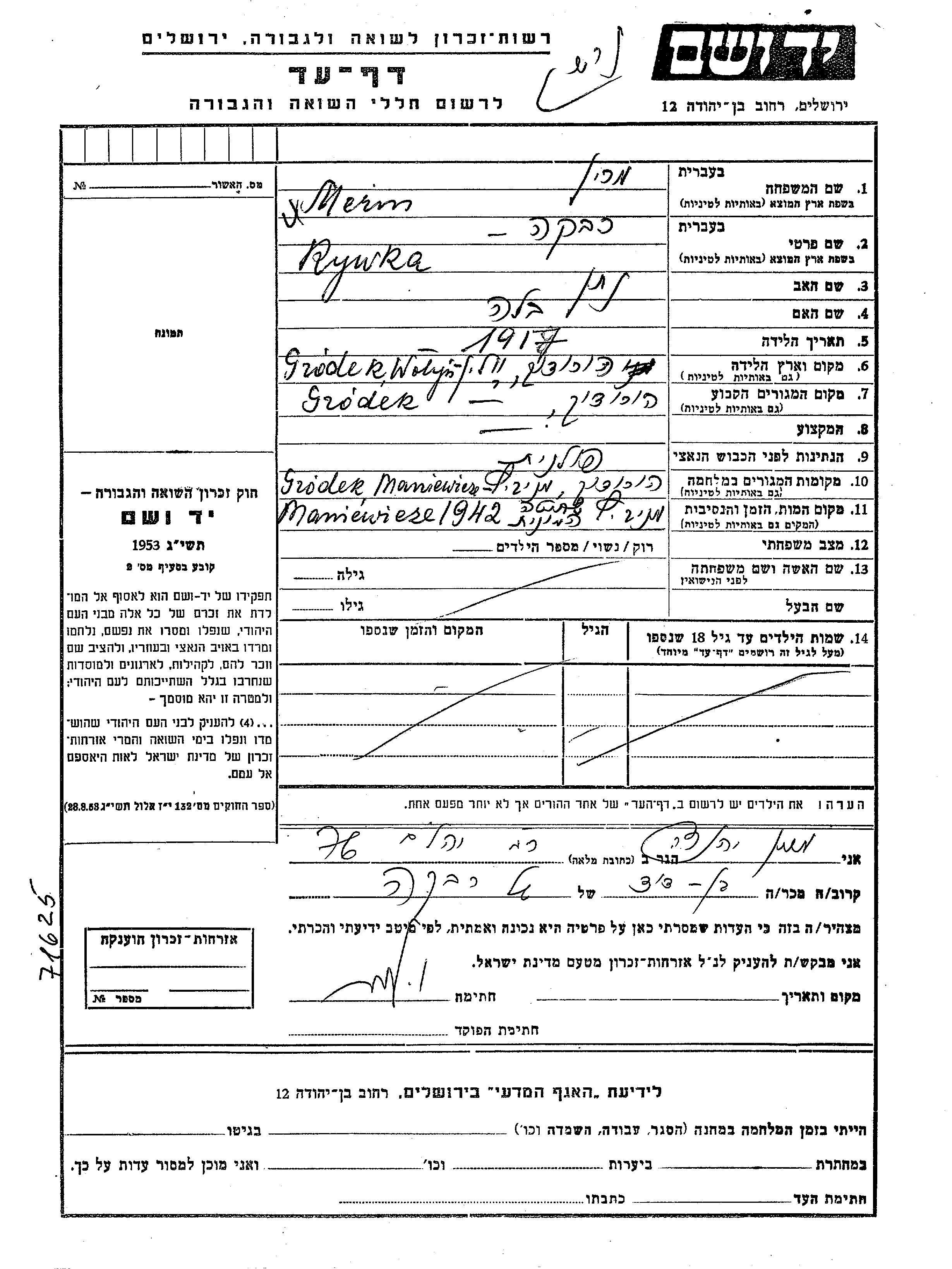 Merin Marin Rywka 1917 Gródek, Poland Page of Testimony