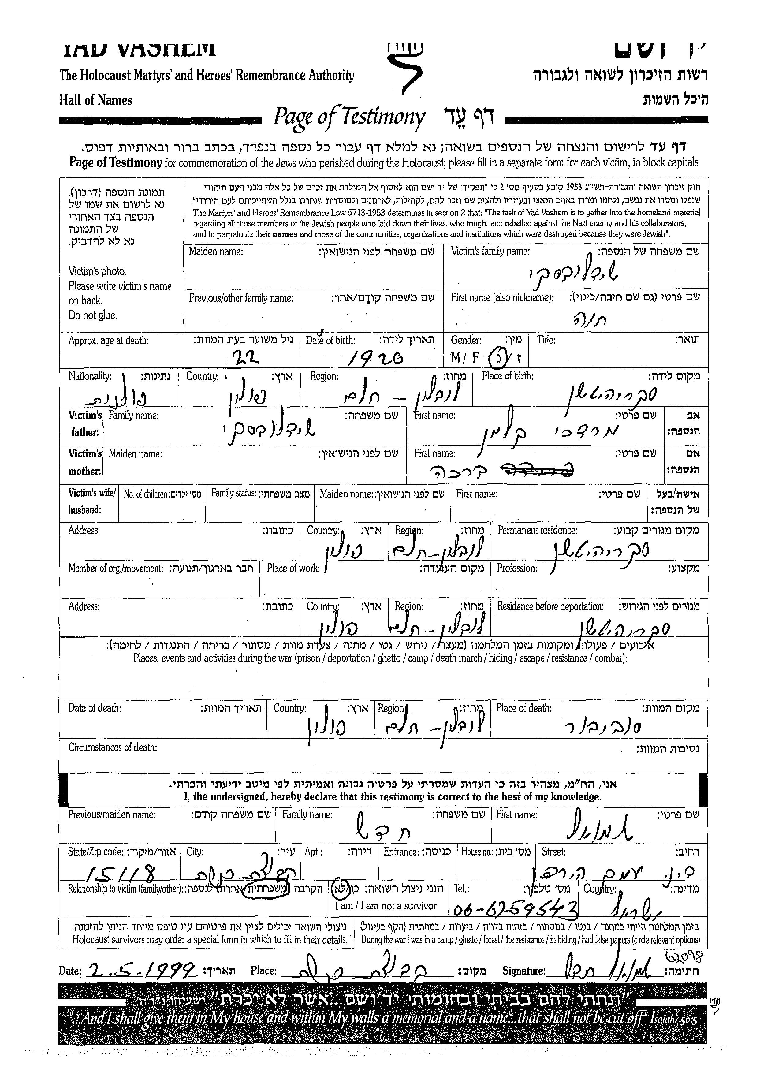 Khava Shidlovski was born in Skryhiczyn, Poland, 1920 to Mordekhai Kalman and Brakha. Prior to WWII she lived in Skryhiczyn, Poland. During the war she was in Skryhiczyn, Poland. Khava was murdered in the Shoah. Place of death: Sobibor, Poland.