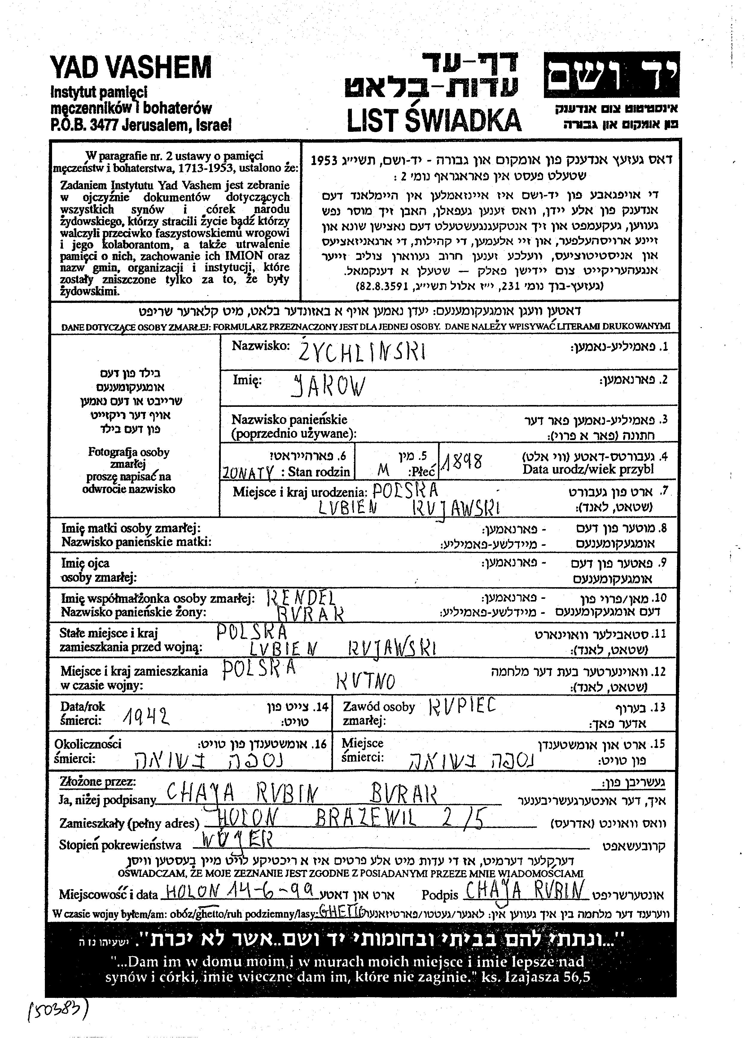 Zychlinski Jakow 1898 Lubien Kujawski, Poland Page of Testimony