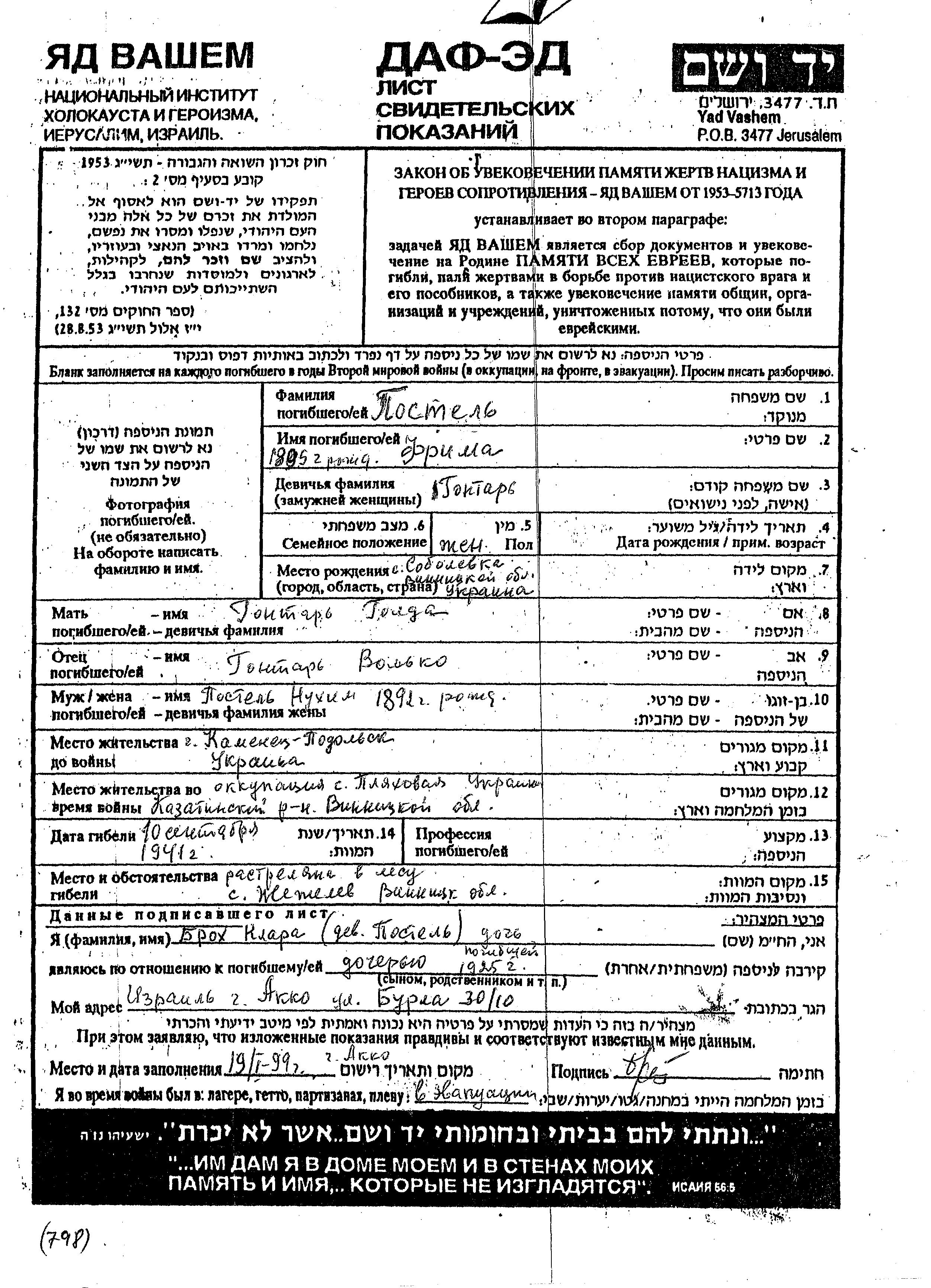 Frima Postel nee Gontar was born in Sobolevka, Ukraine (USSR), 1895 to Volko and Golda. She was married to Nukhim. Prior to WWII she lived in Kamenets Podolskiy, Ukraine (USSR). During the war she was in Plyakhovaya, Ukraine (USSR). Frima was murdered in the Shoah. Place of death: Zhezhelev, Ukraine (USSR), 1941.