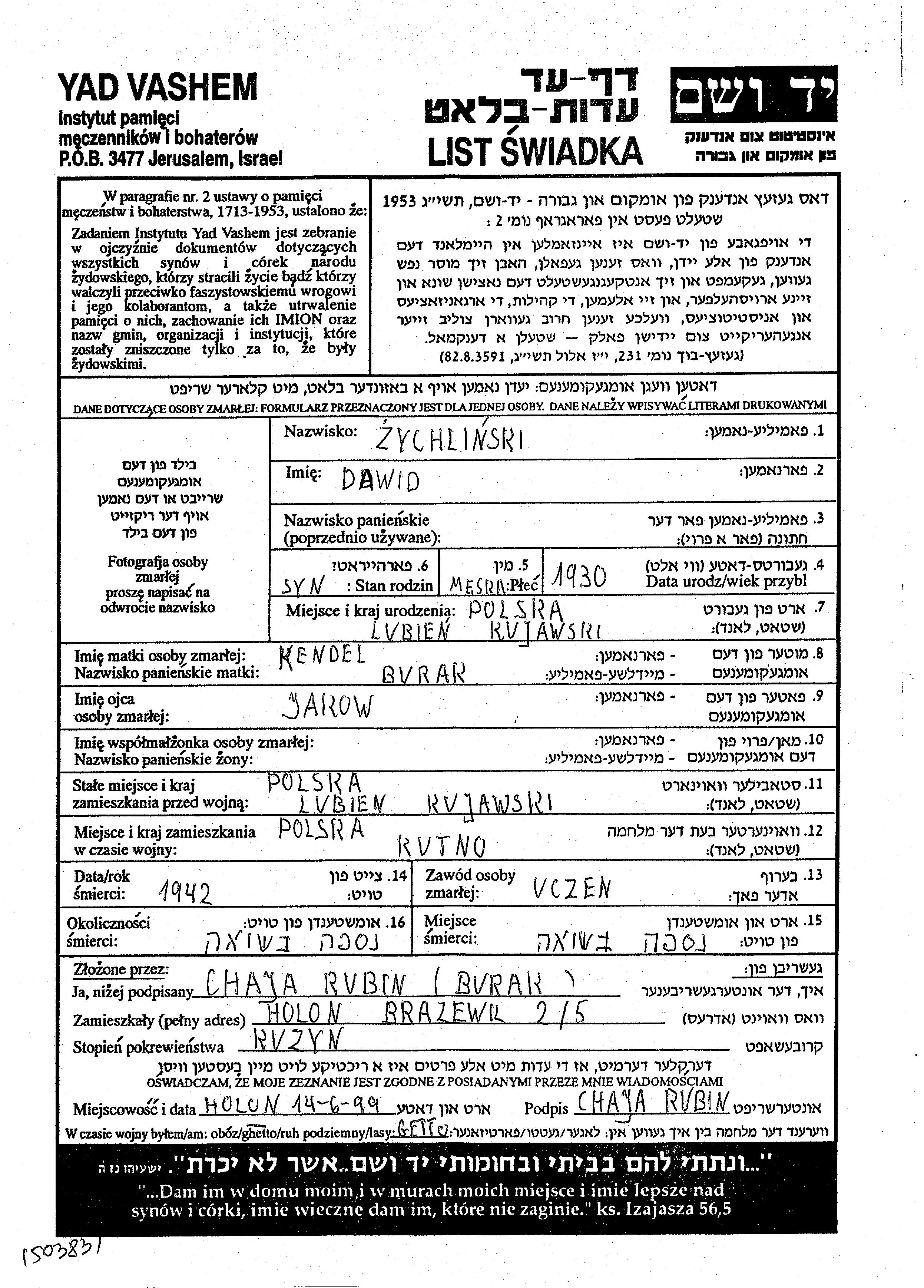 Zychlinski Dawid 1930 Lubien Kujawski, Poland Page of Testimony