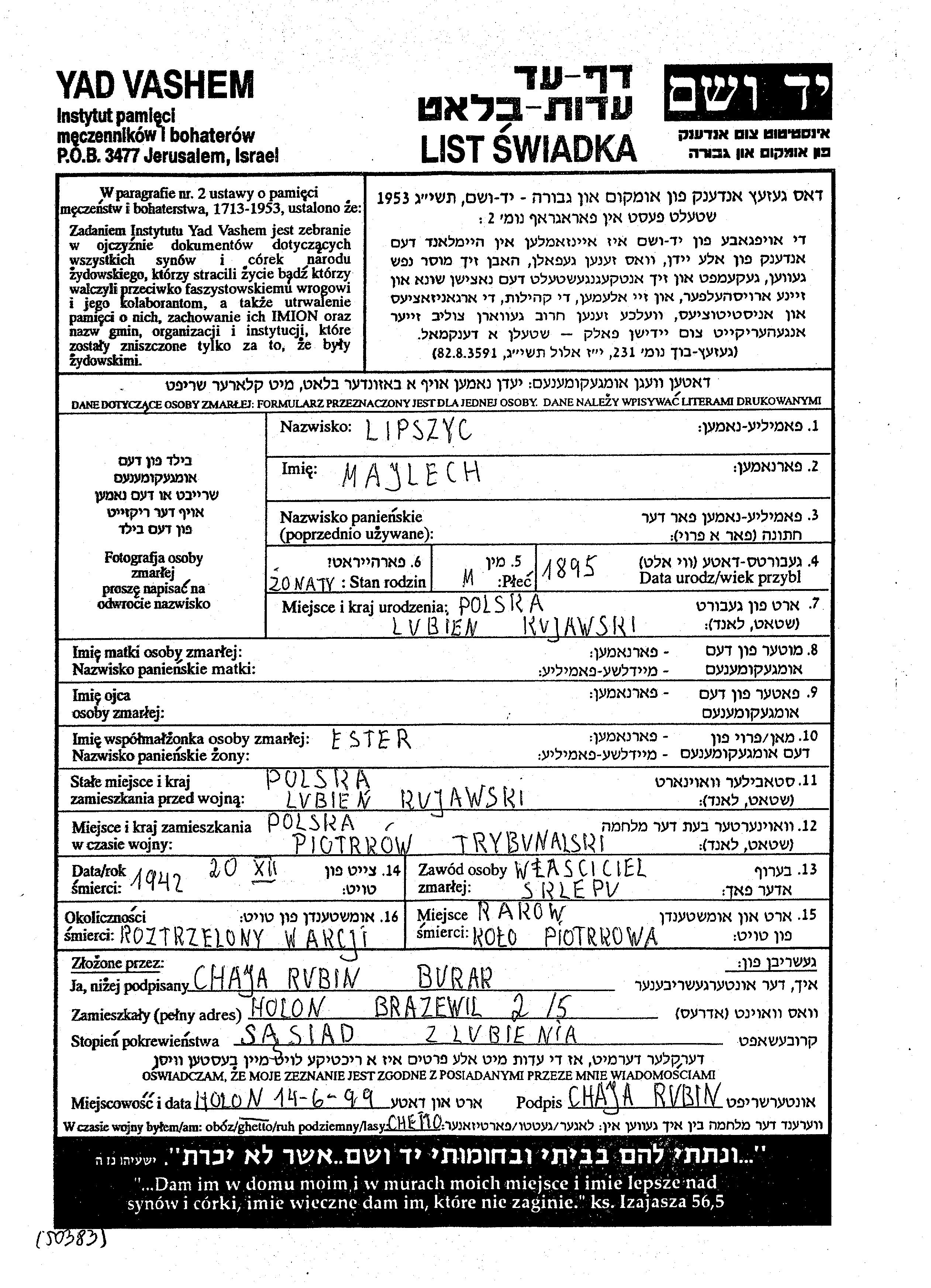Lipszyc Majlech 1895 Lubien Kujawski, Poland Page of Testimony