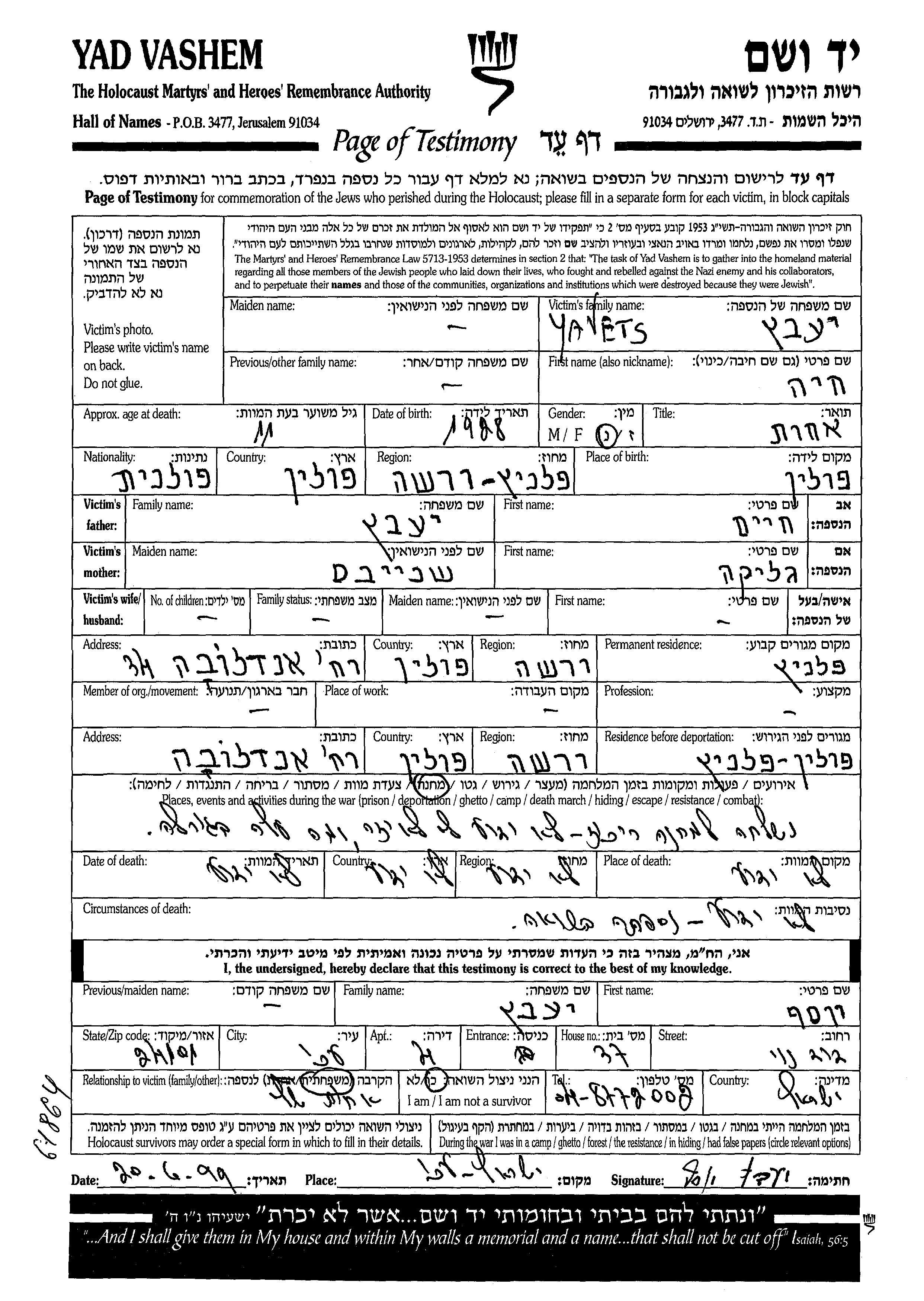 Yad Vashem - Pages of Testimony Names Memorial Collection
