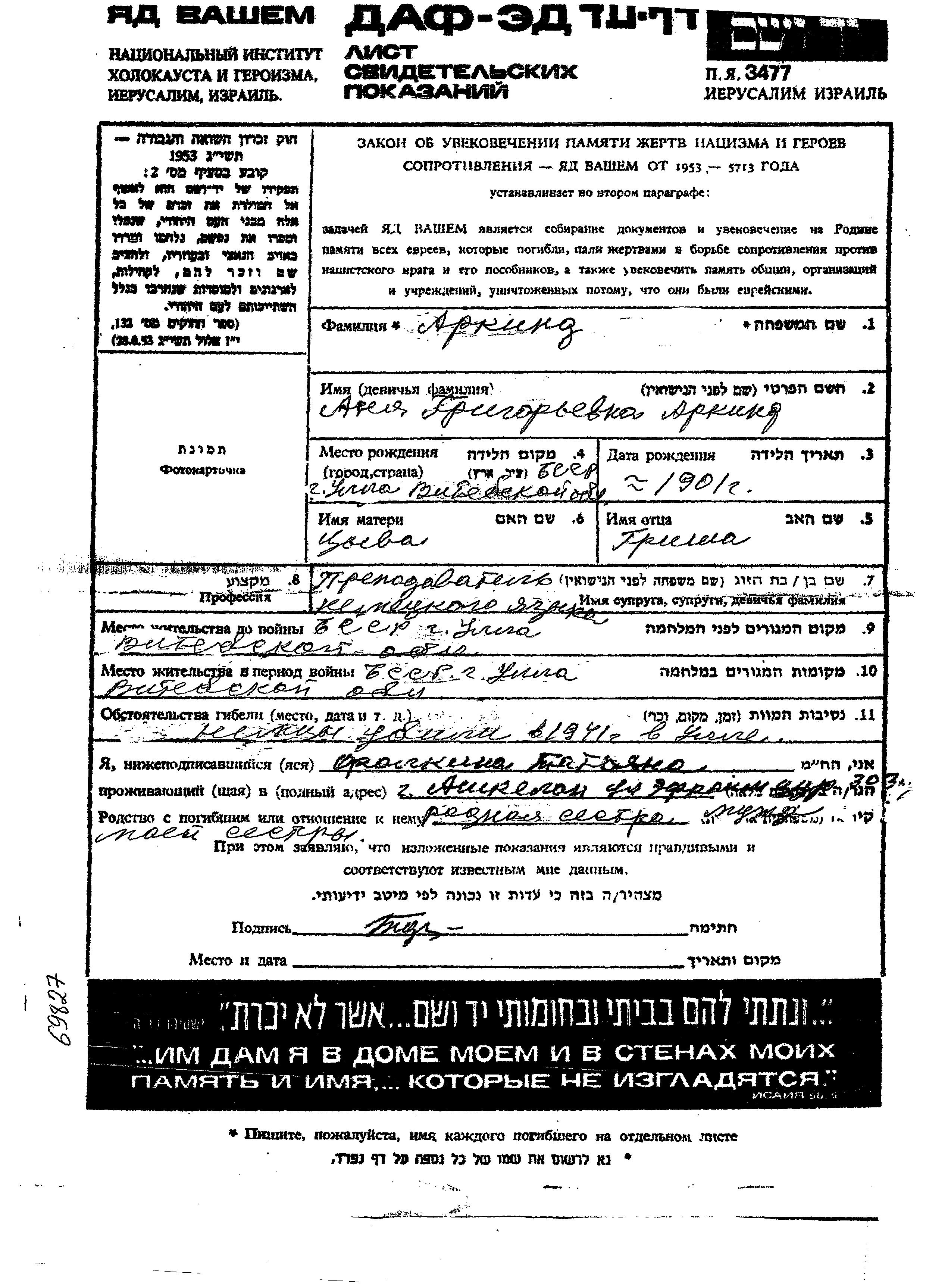 Arkind Anya 1901 Ulla, Belorussia (USSR) Page of Testimony