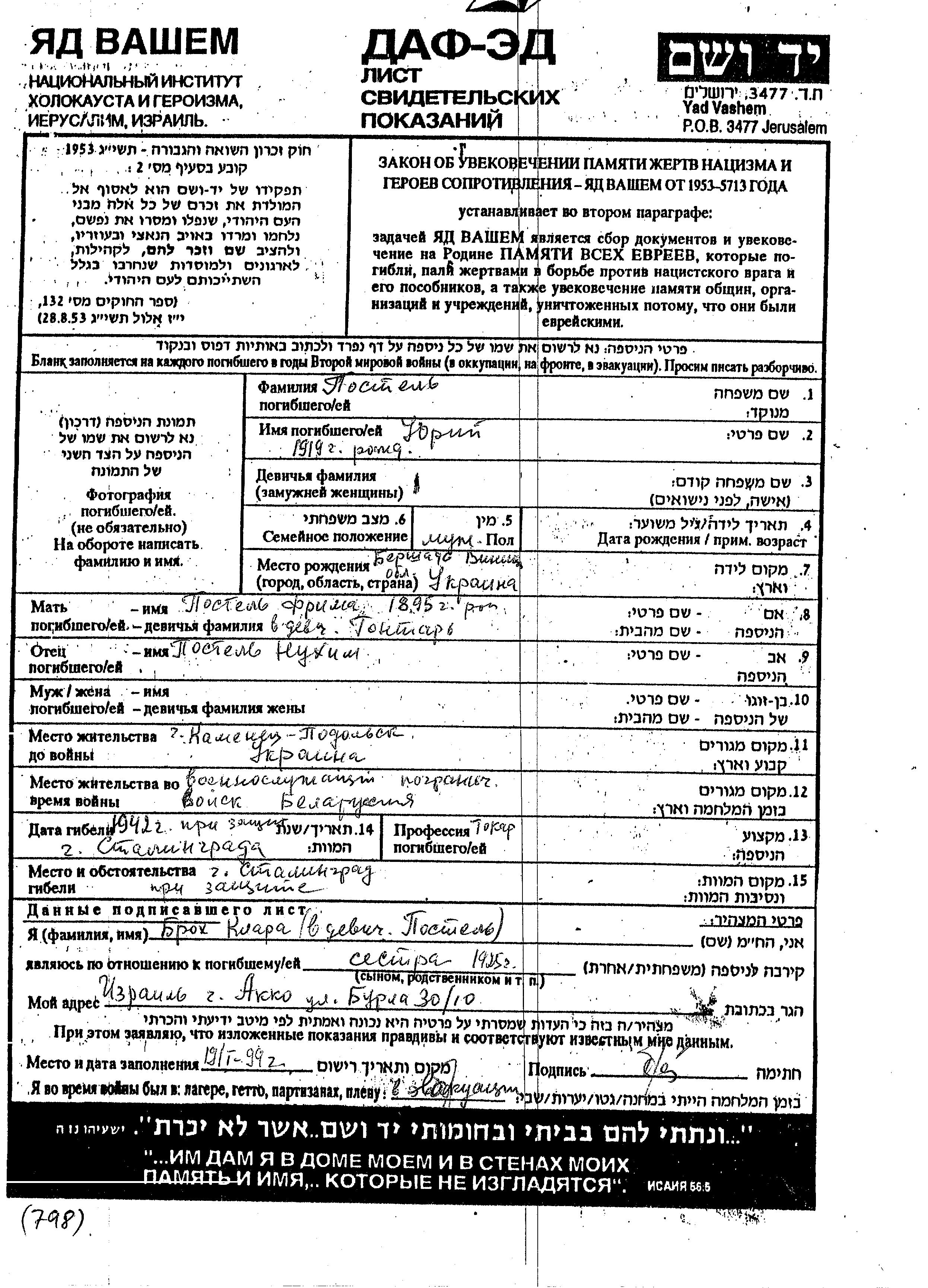 Yuri Postel was born in Vinnitza, Ukraine (USSR), 1919 to Nukhim and Frima. He was a turner. Prior to WWII he lived in Kamenets Podolsk, Ukraine (USSR). During the war he was in the Soviet armed forces. Yuri was killed in military service in WWII. Place of death: Stalingrad, Russia (USSR), 1942.