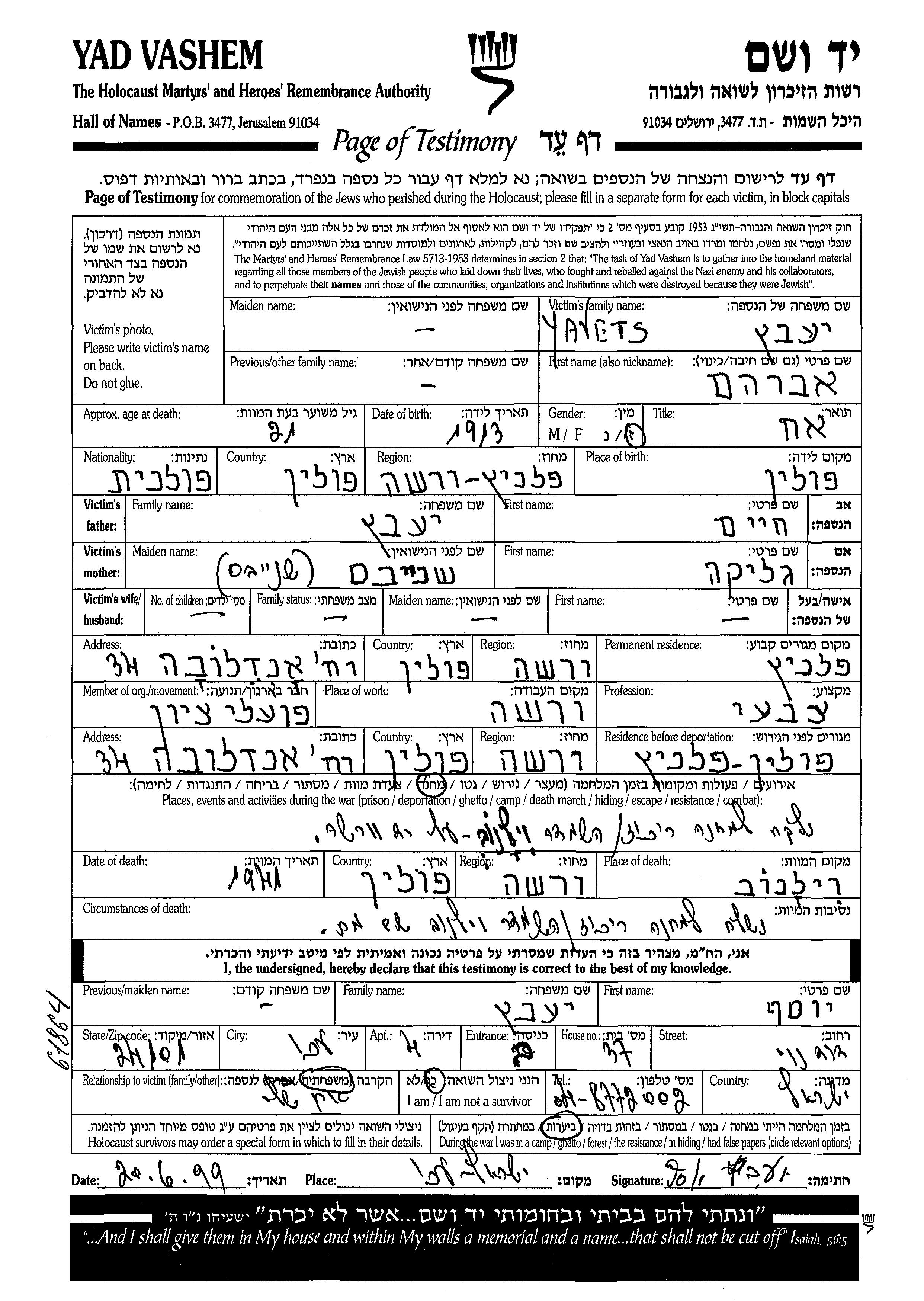 Yad Vashem - Pages of Testimony Names Memorial Collection