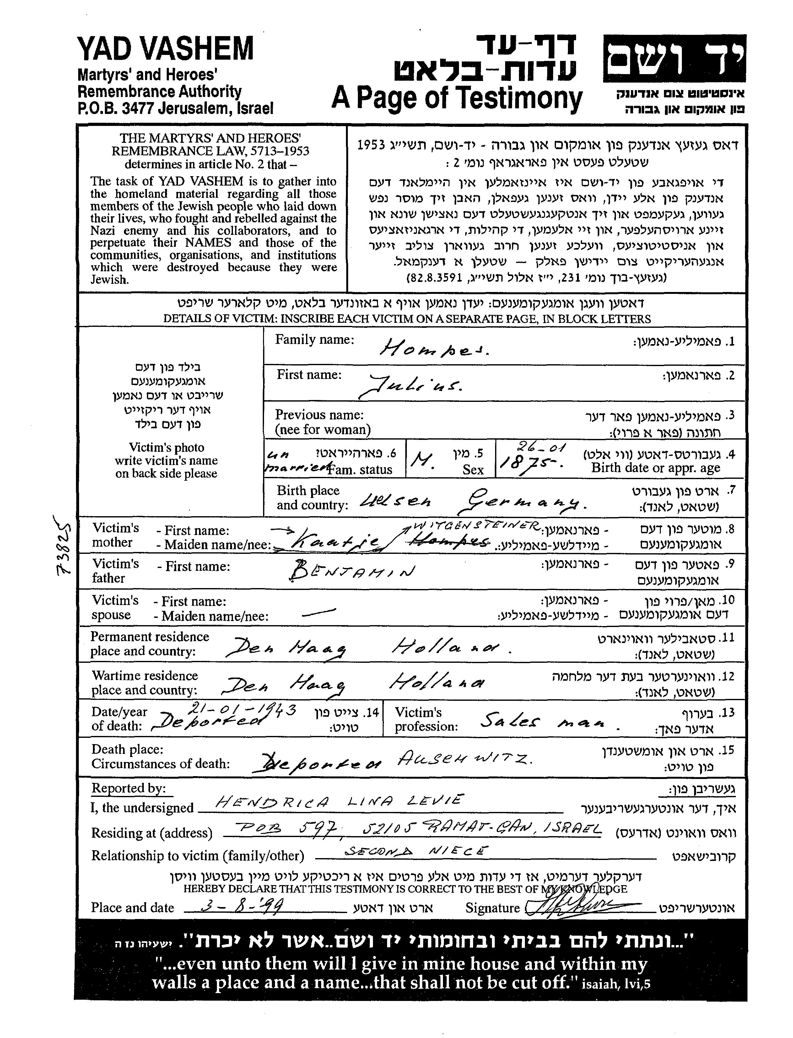Julius Hompes was born in Uelsen, Germany, 1875 to Benjamin and Kaatje. He was a salesman in a warehouse and single. Prior to WWII he lived in Den Haag, The Netherlands. During the war he was in Den Haag, The Netherlands. Julius was murdered in the Shoah. Place of death: Auschwitz, Poland, 1943.